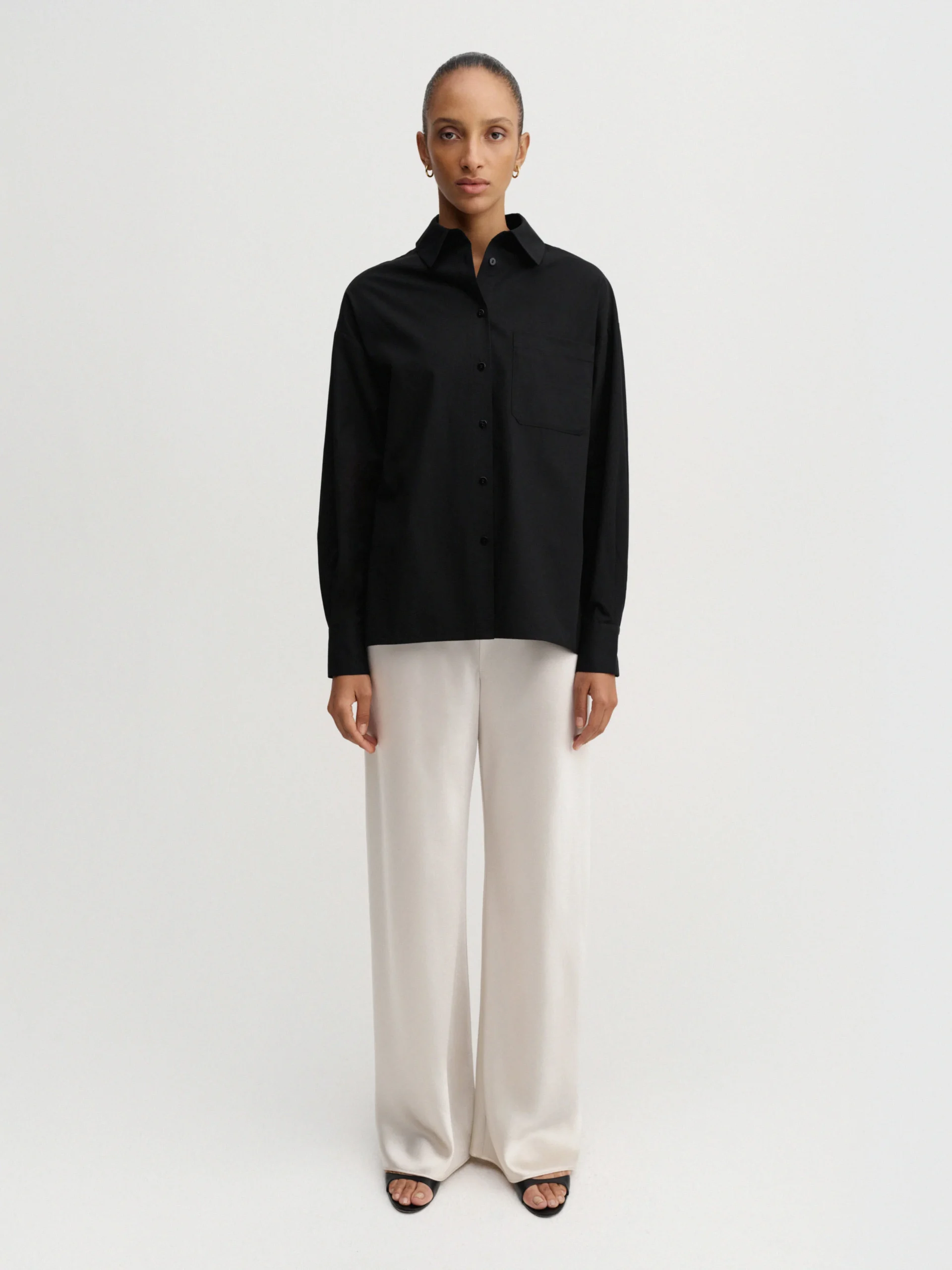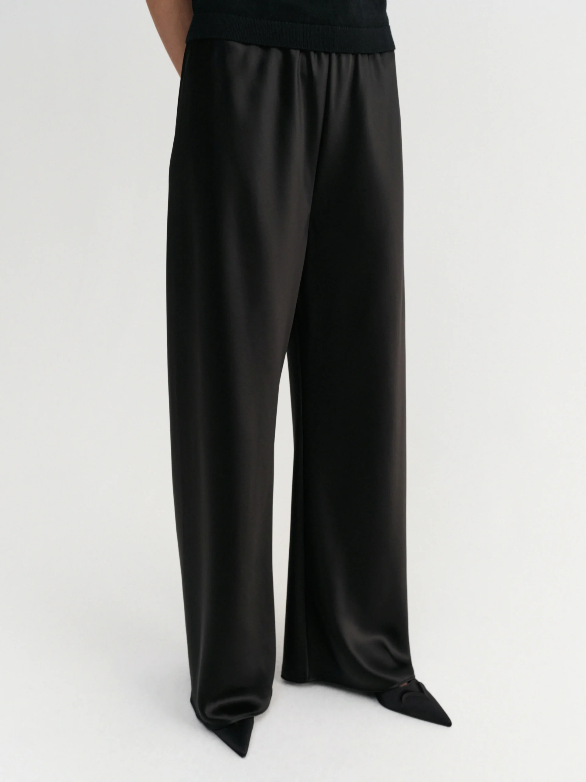 Bias Satin Pants are made from a luxurious and responsible fabric comprising 75% Naia™ acetate and 25% polyester. This blend offers a sumptuous and environmentally conscious option compared to regular silk. The material has a naturally silky feel that is comfortable to wear and easy to care. Wrinkles less than silk, and can be washed in a washing machine without losing its shine and texture. The pants are designed with a high-rise and wide-leg fit, complemented by an elasticated waistband for added comfort. The elasticity of the waistband also provides flexibility in choosing how high or low you want to wear the pants. The bias cut enhances the pants’ beautiful fall and overall appearance.