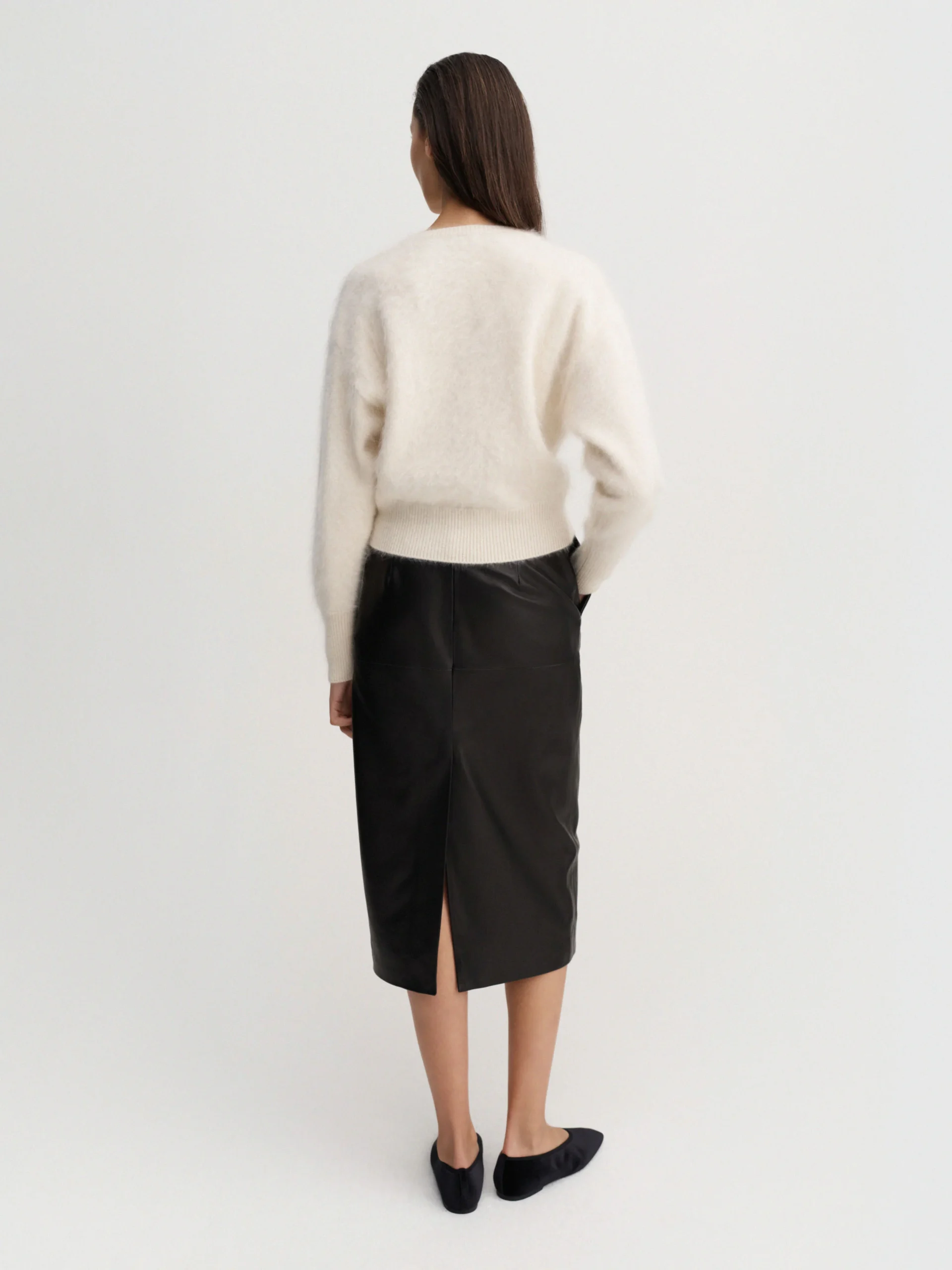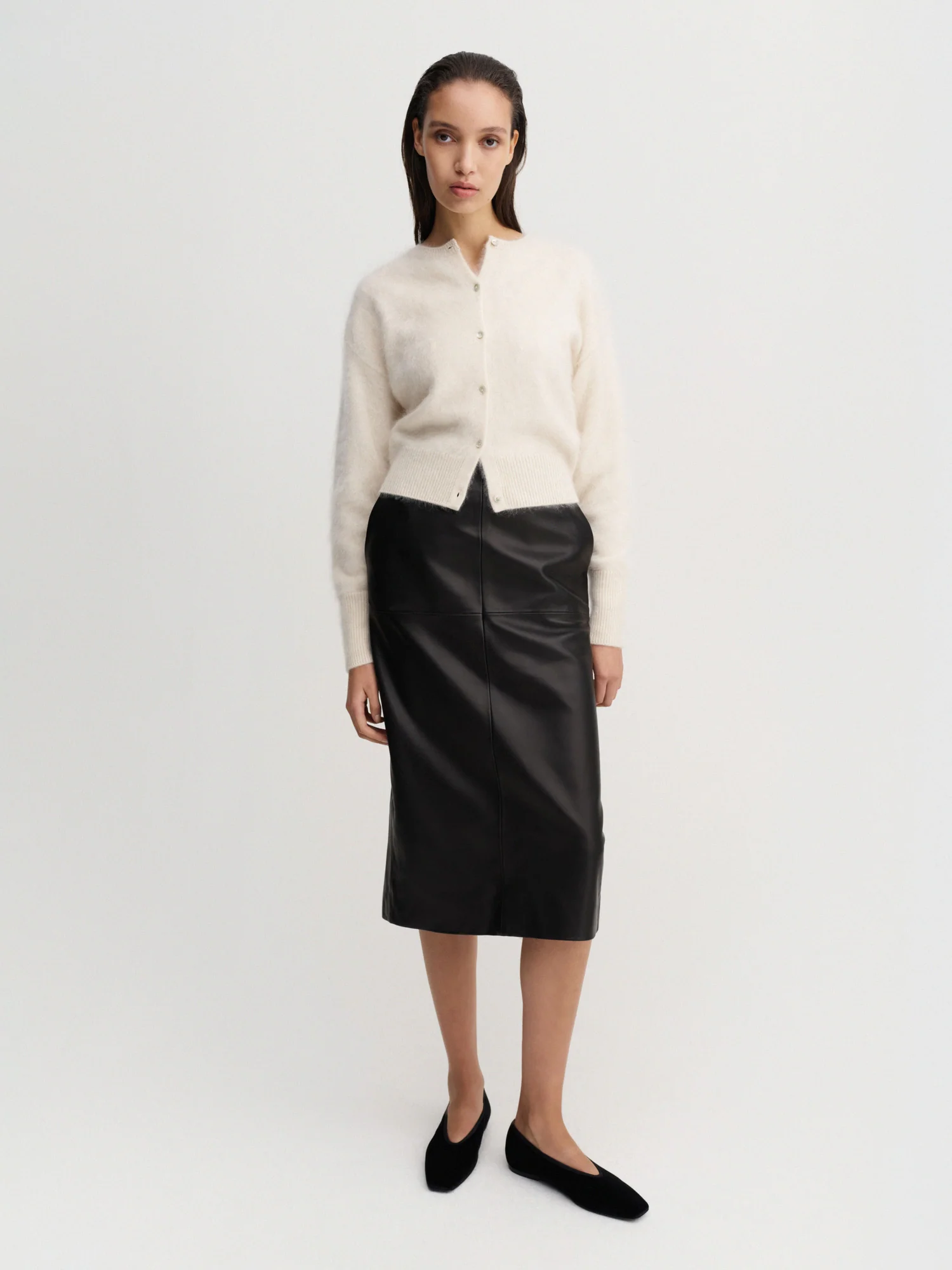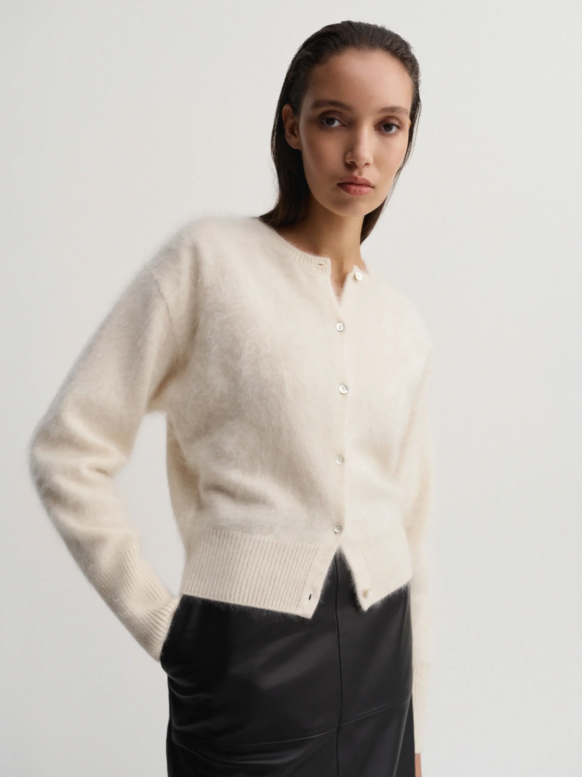 Coco Brushed Cardigan is knitted from super soft brushed cashmere with a hairy finish. The cardigan is designed for a slightly loose fit with a silhouette that sits tighter on the waist and end of the sleeves for easy roll up. It is featured with a classic crew neckline, dropped shoulders and fastens with tonal cashmere buttons through the front. Rib-knitted detailing in cuffs and hem.