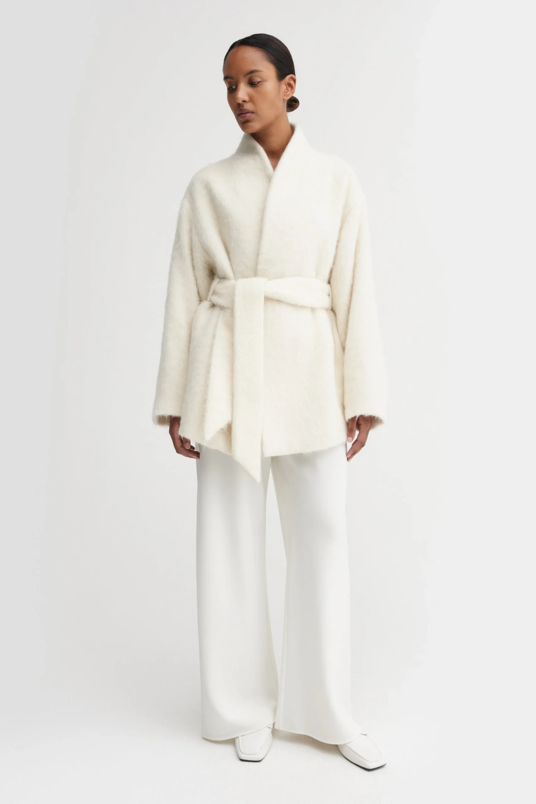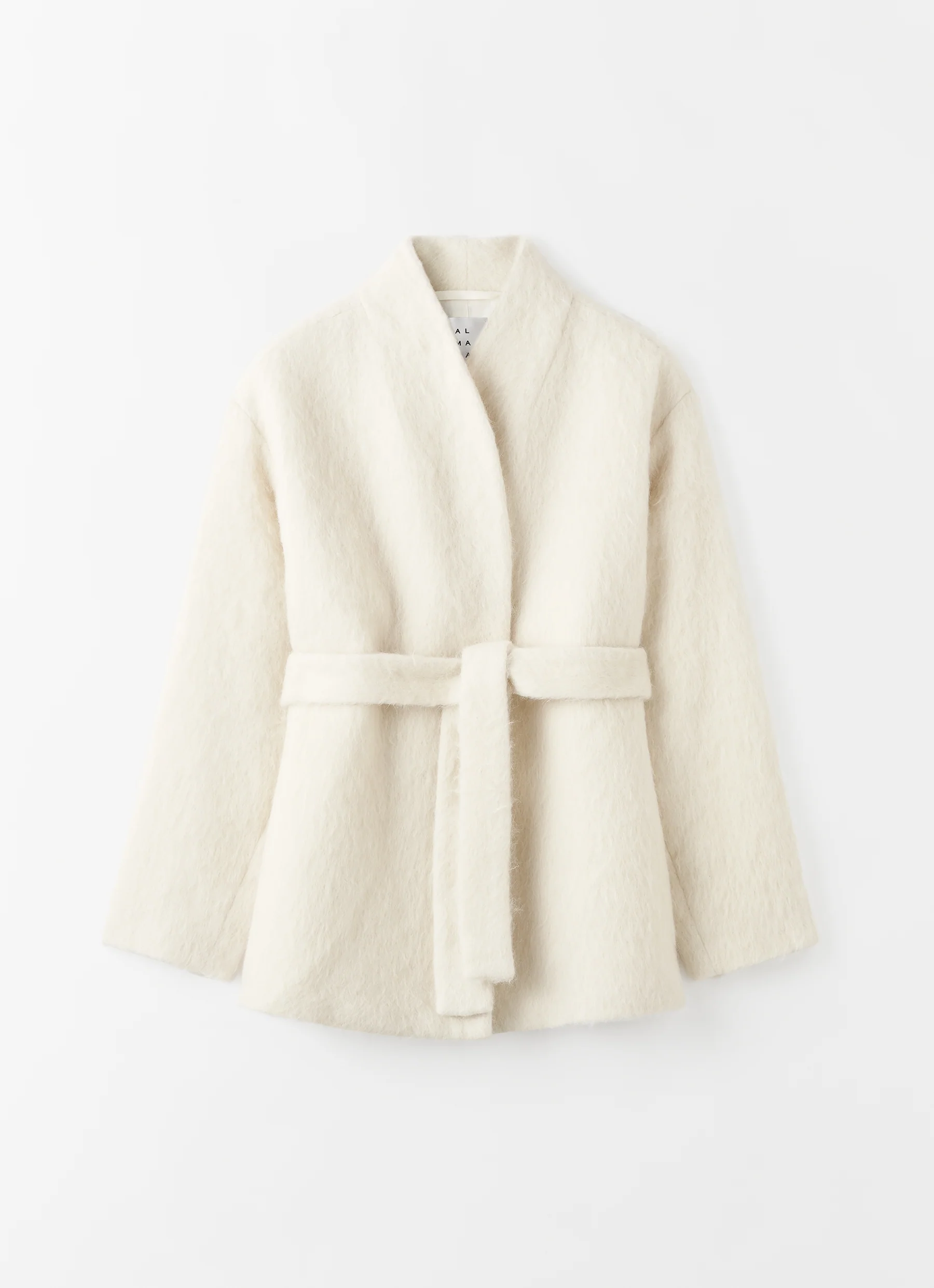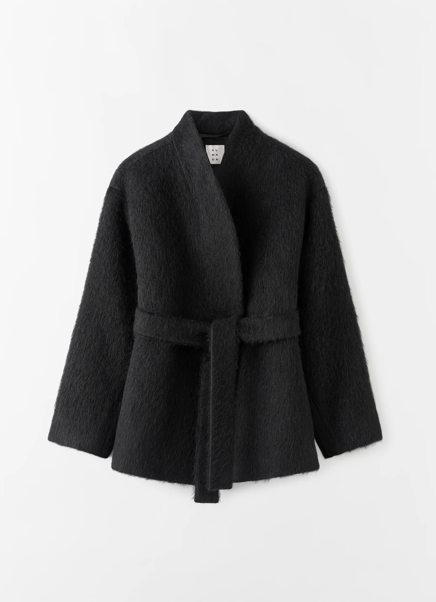 Noorie Coat is crafted from a luxurious blend of thick alpaca and virgin wool. The coat has a slightly textured surface with an elegant touch, while its natural properties repel dirt effortlessly. Featured with a rounded neckline, dropped shoulders, pockets at side seams and a wide belt. Fully lined inside. The coat has a slightly rounded shape and is designed for a relaxed slightly oversized fit. Wear it either tied up or undone.