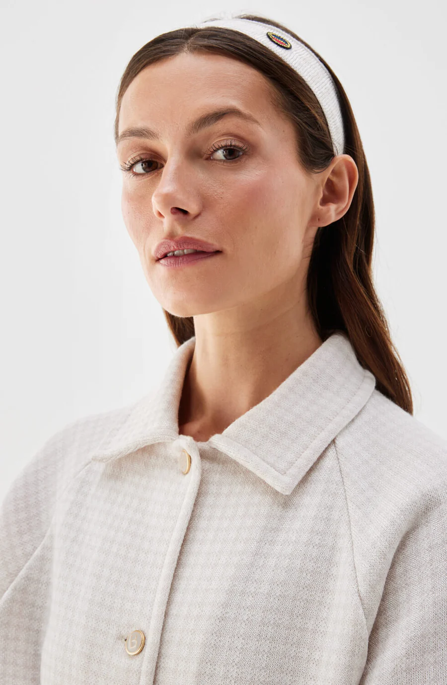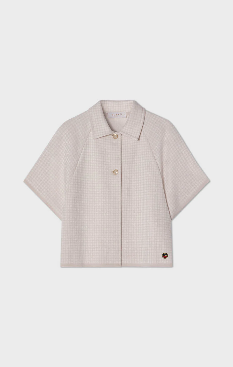 Amelie checked short cape is a single-breasted cape crafted from a wool and viscose blend. It features a collar, gold-tone buttons, and wide, short sleeves. The subtle checked pattern adds an elegant touch, while the material mix of wool and viscose gives the fabric a refined sheen.