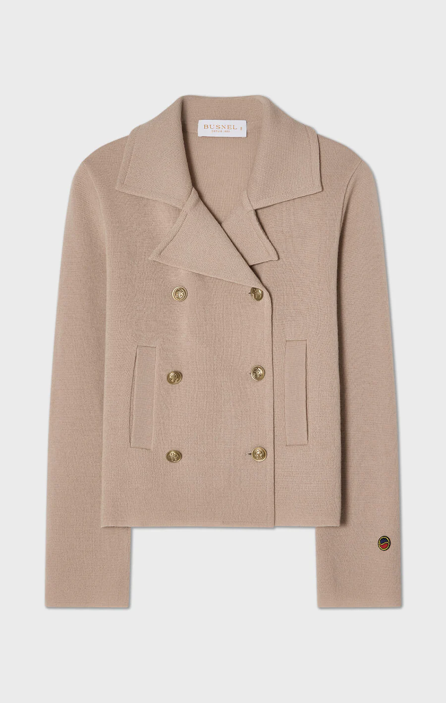 Indra knitted wool jacket is a short knitted wool jacket and blazer made in France. It is hip-length and features a timeless, feminine silhouette that can be adjusted with the double-breasted closure. The jacket has front pockets and gold buttons. It can be worn as a short blazer or as an outer layer.