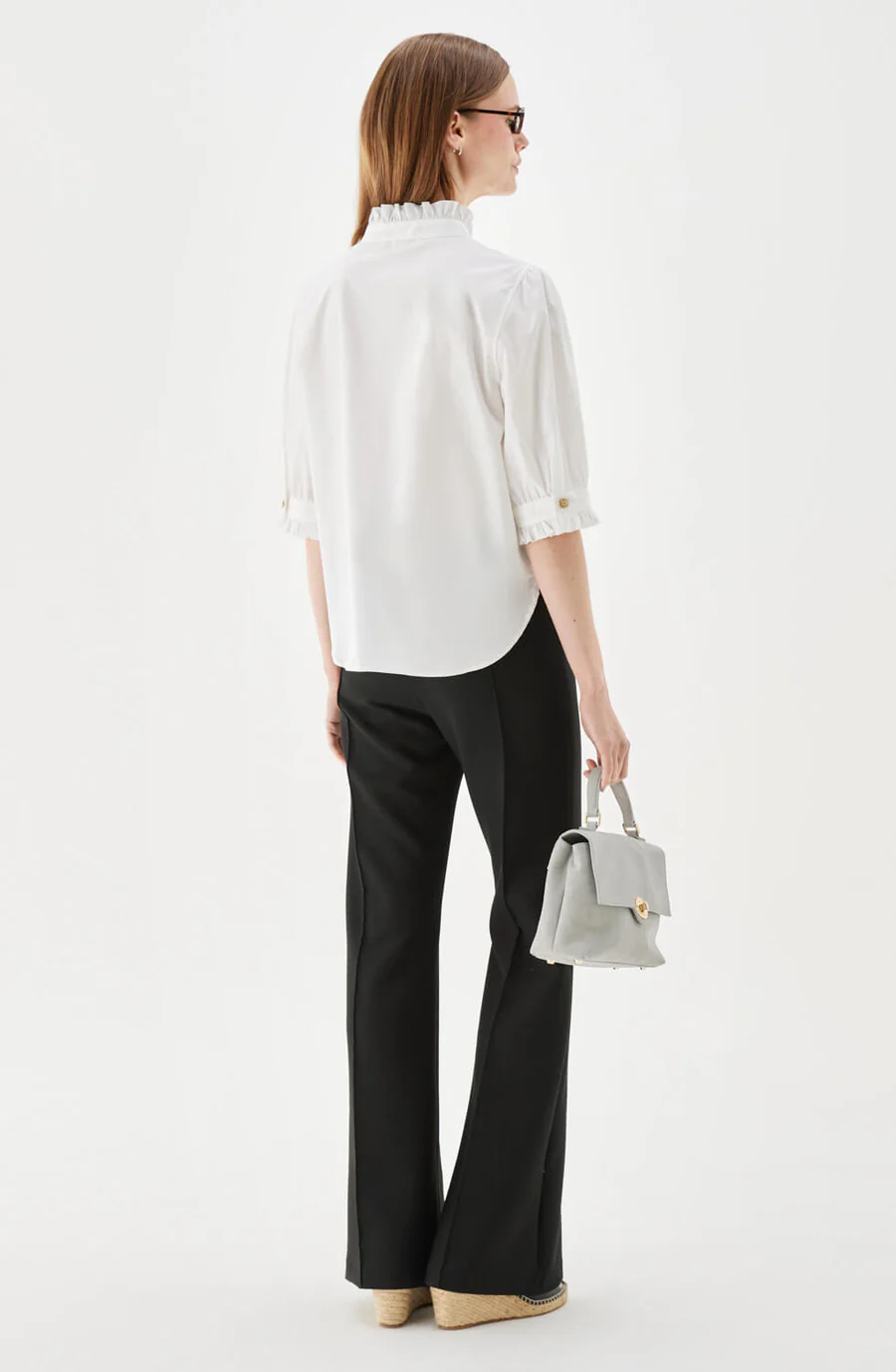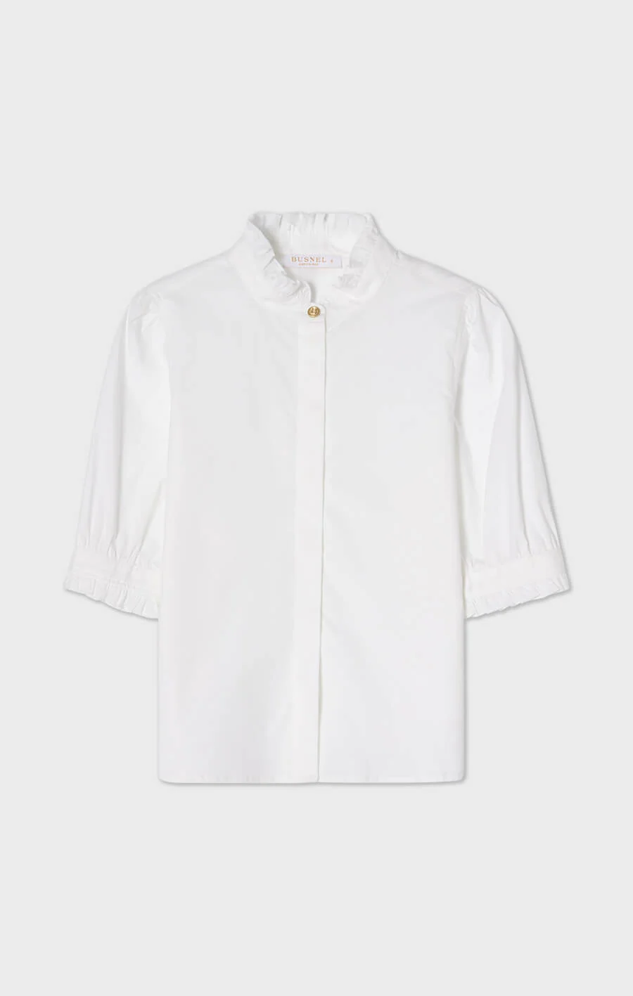 Mica short-sleeved blouse is an elegant shirt-style blouse crafted from stretch cotton poplin. It features a feminine silhouette with short puff sleeves, delicate ruffle details at the cuffs and small stand collar, adding a soft yet sophisticated touch. The decorative gold buttons along the front bring a subtle shine, making this blouse perfect for both everyday wear and more dressed-up occasions.