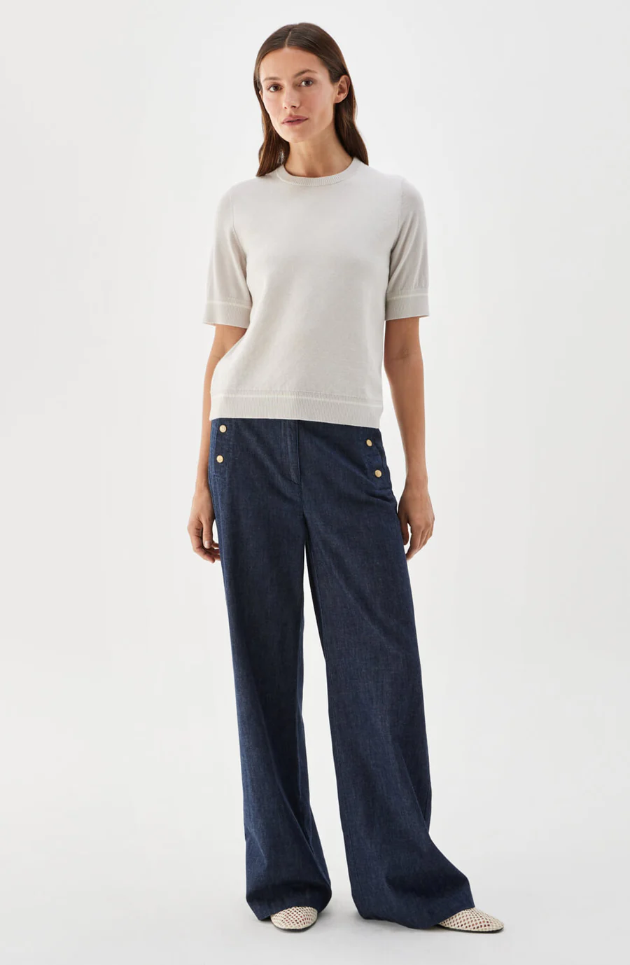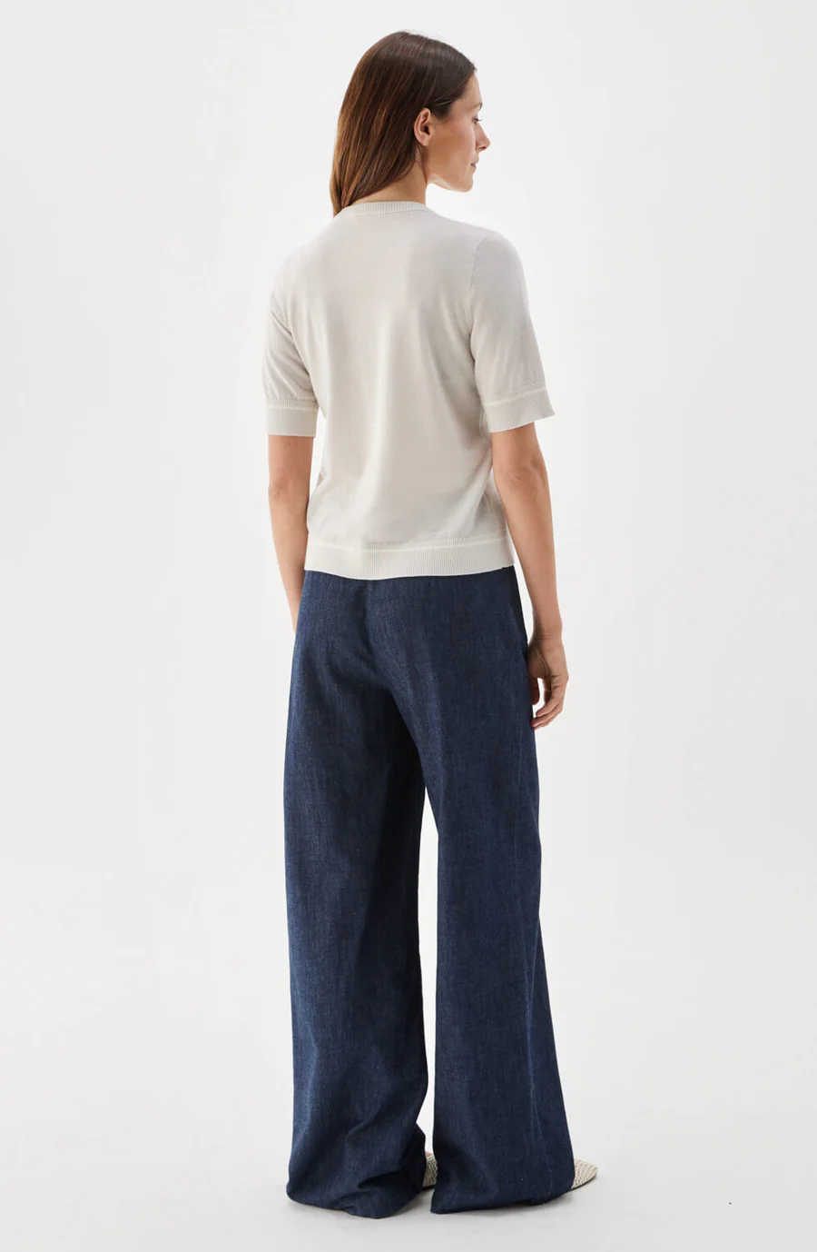 Paulina fine-knit patterned top is a short-sleeved T-shirt style knitted in soft merino wool. It features a regular fit, round neckline, short sleeves, and a subtle pattern created by the jacquard knit.
