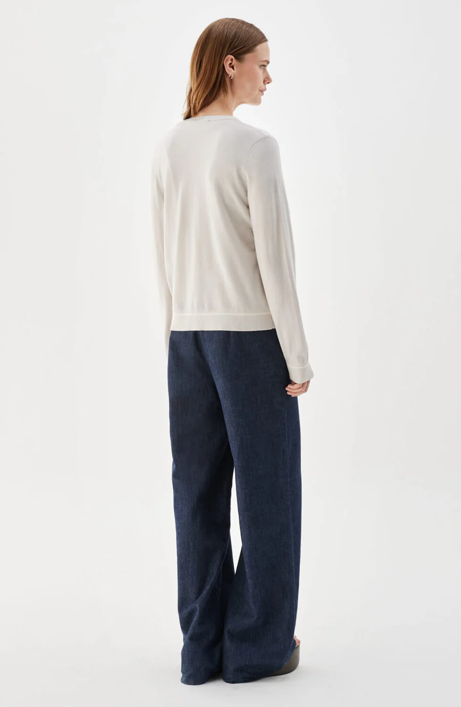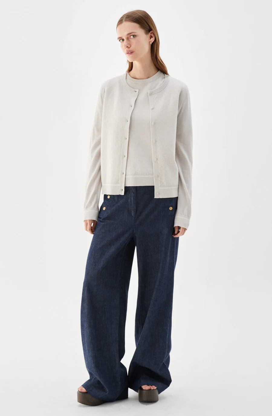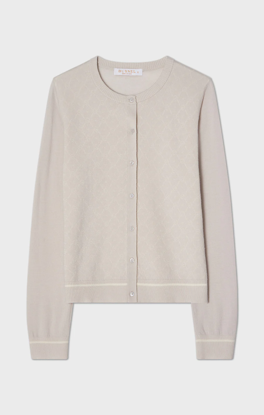 Penelope fine-knit cardigan is crafted from soft merino wool in the same delicate jacquard knit as the matching top. It features a regular fit, round neckline, front closure with gold buttons, and ribbed trims. The subtle pattern adds a refined texture and a timeless look to this elegant layering piece