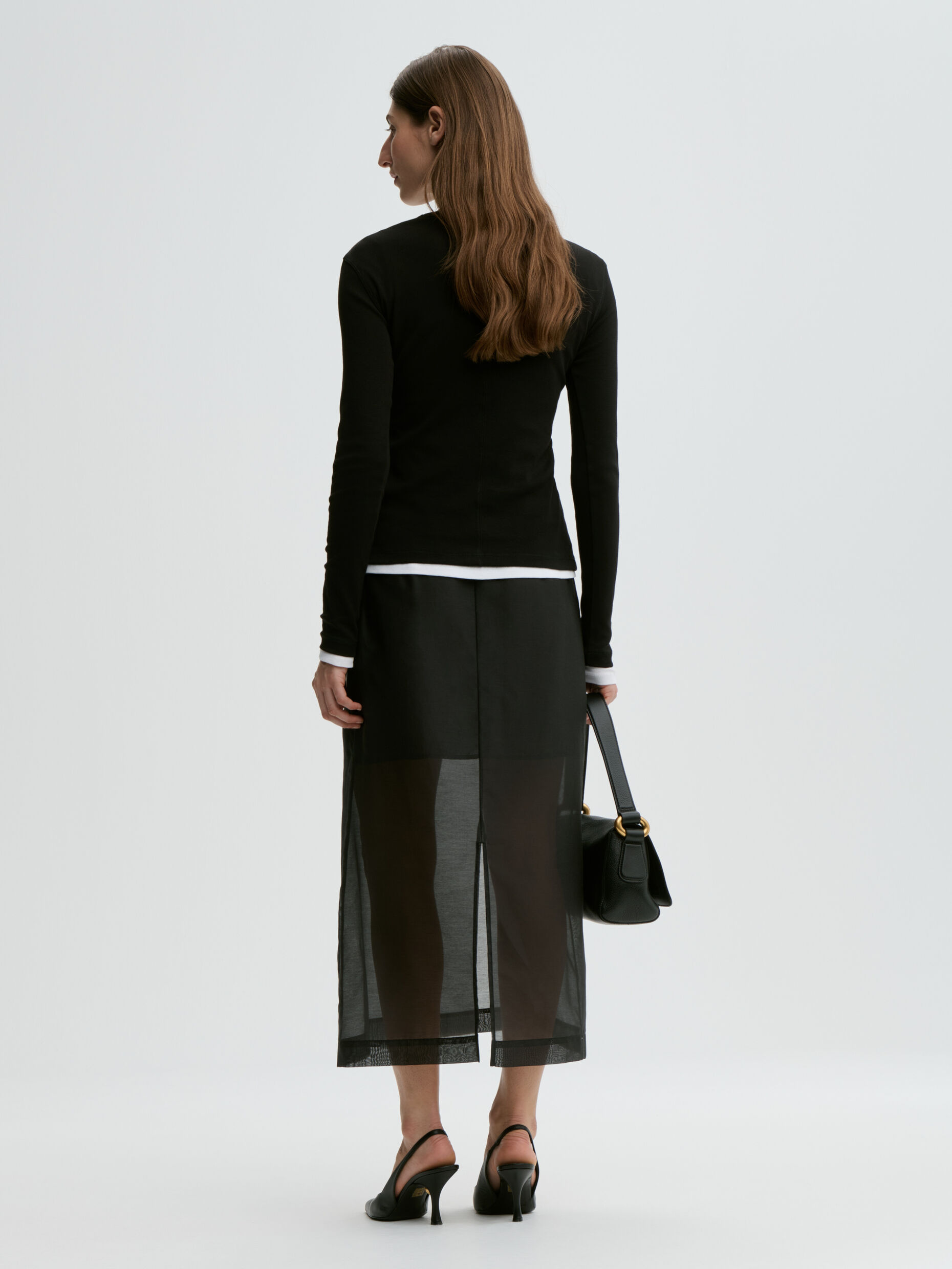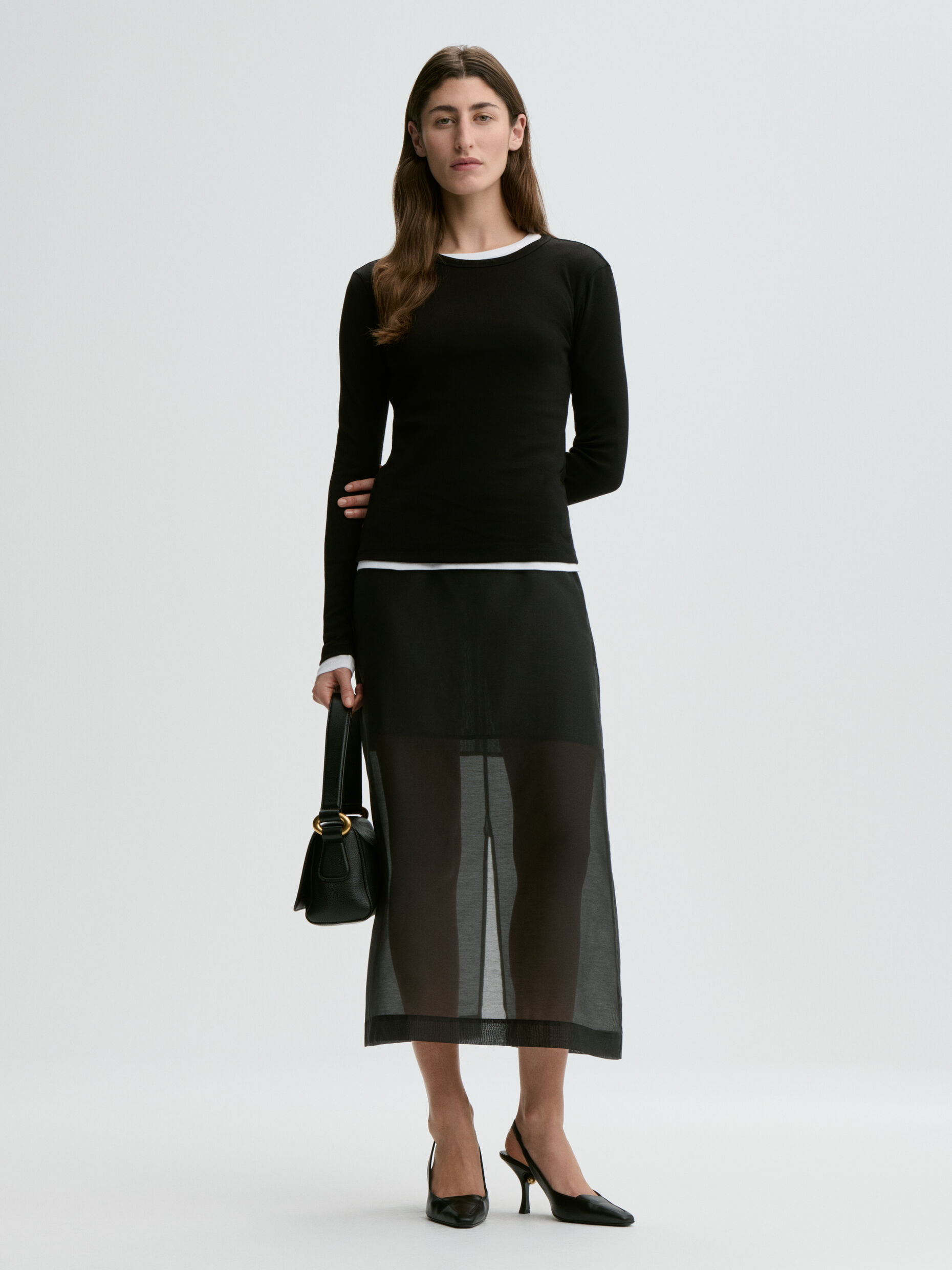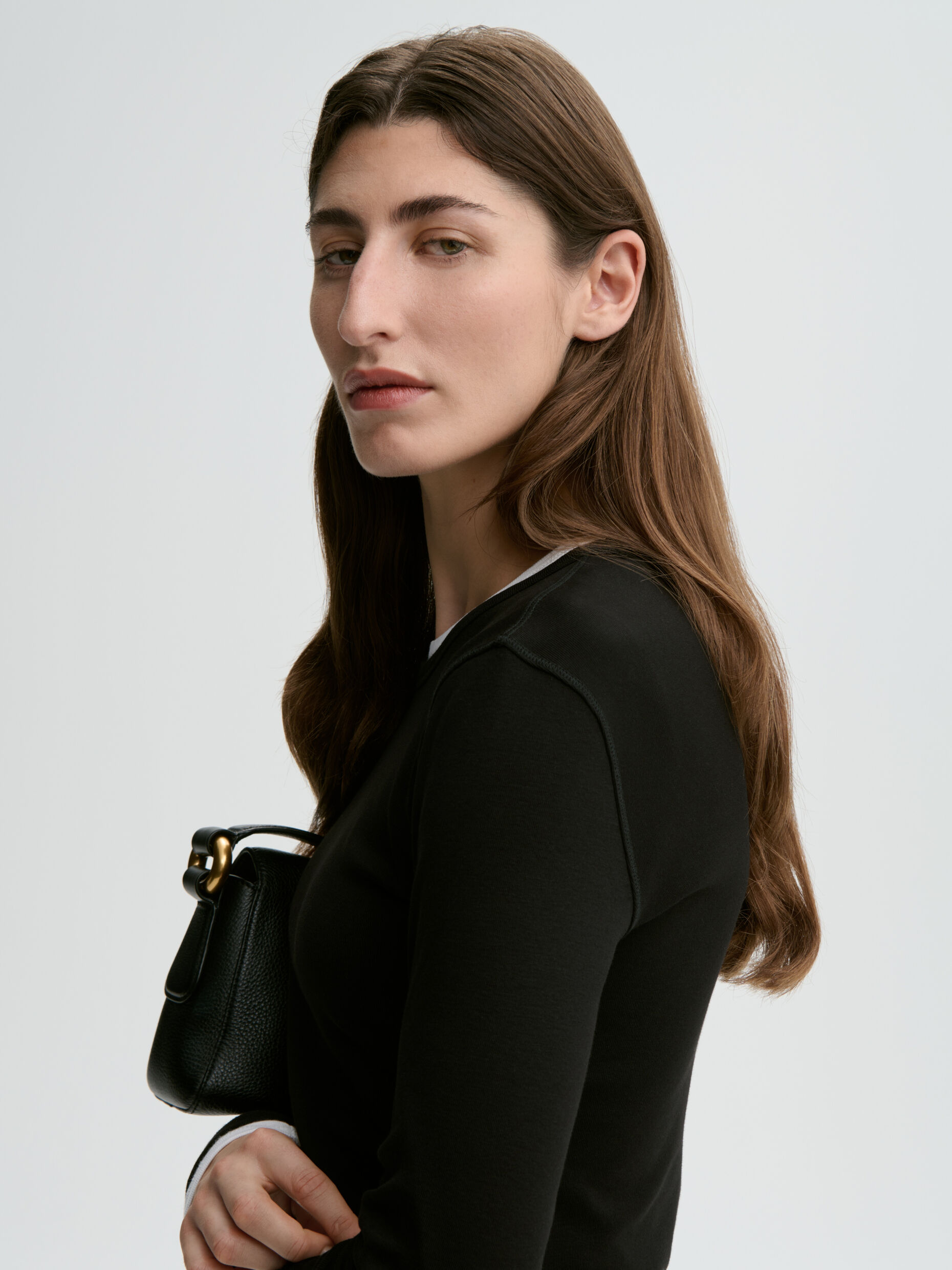 No matter the time of year, a minimalistic T-shirt with long sleeves is ideal for layering – such is the Brita design. The organic cotton T-shirt is detailed with nothing but a small, embroidered monogram.