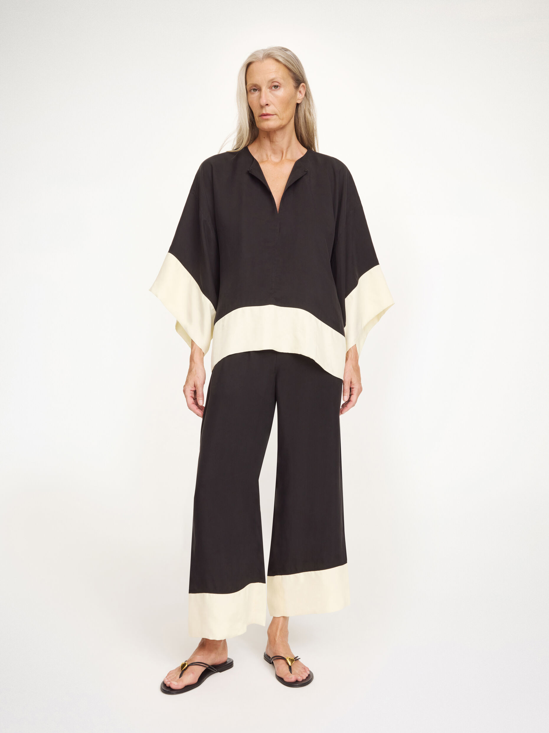 The ultimate elegant piece for cocktail hours and evening events, the Cicie blouse is made in an airy and smooth cupro mix. The square silhouette with cropped sleeves has a deep neckline โ to be left open or closed depending on your mood. Wear with the coordinating Mirabello trousers.