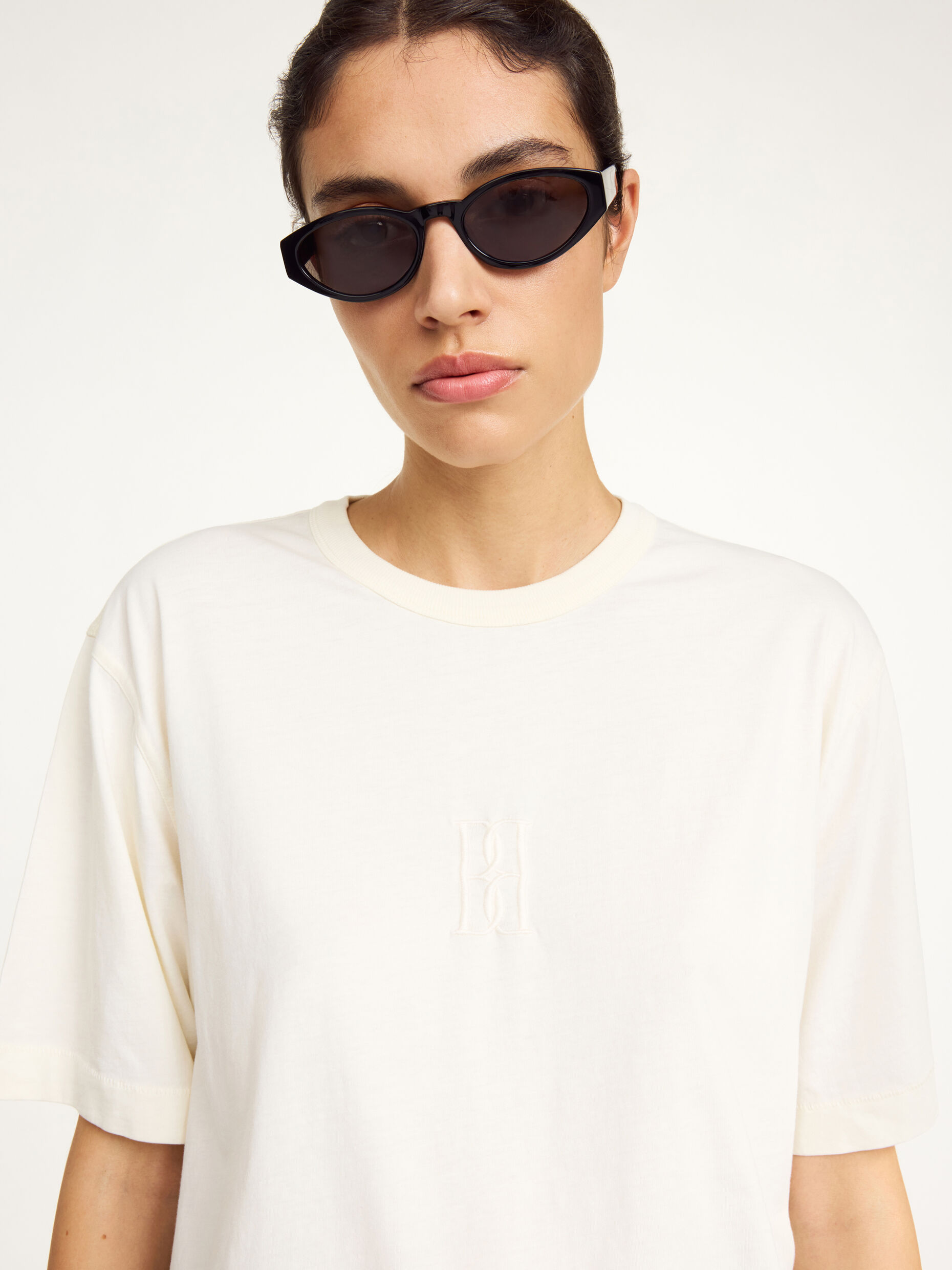 A classic T-shirt, such as the Fayeh design, will last beyond seasons. Made in organic cotton, the T-shirt features an embroidered monogram on its front. Wear yours with everything from miniskirts to tailored trousers and jeans.