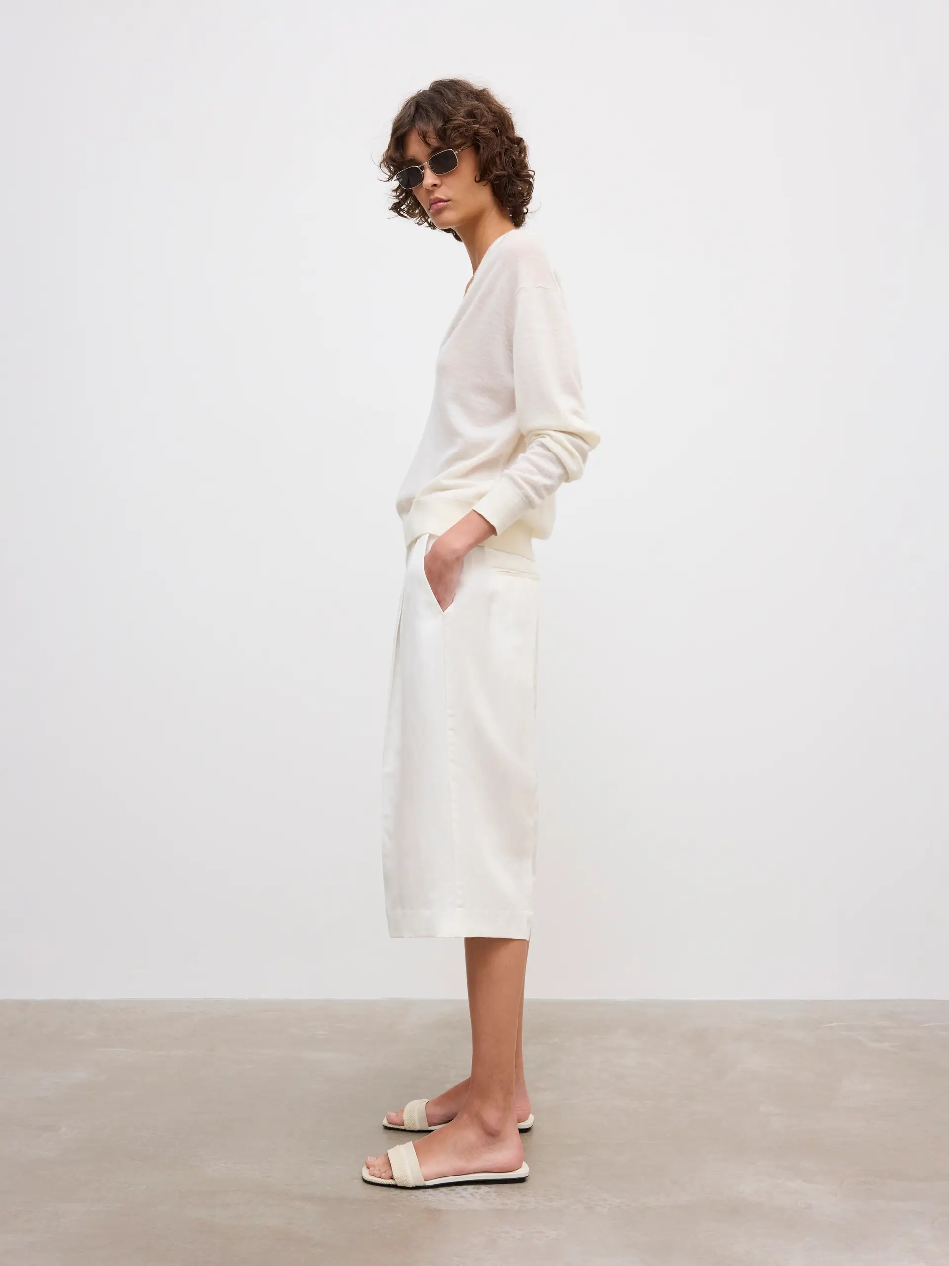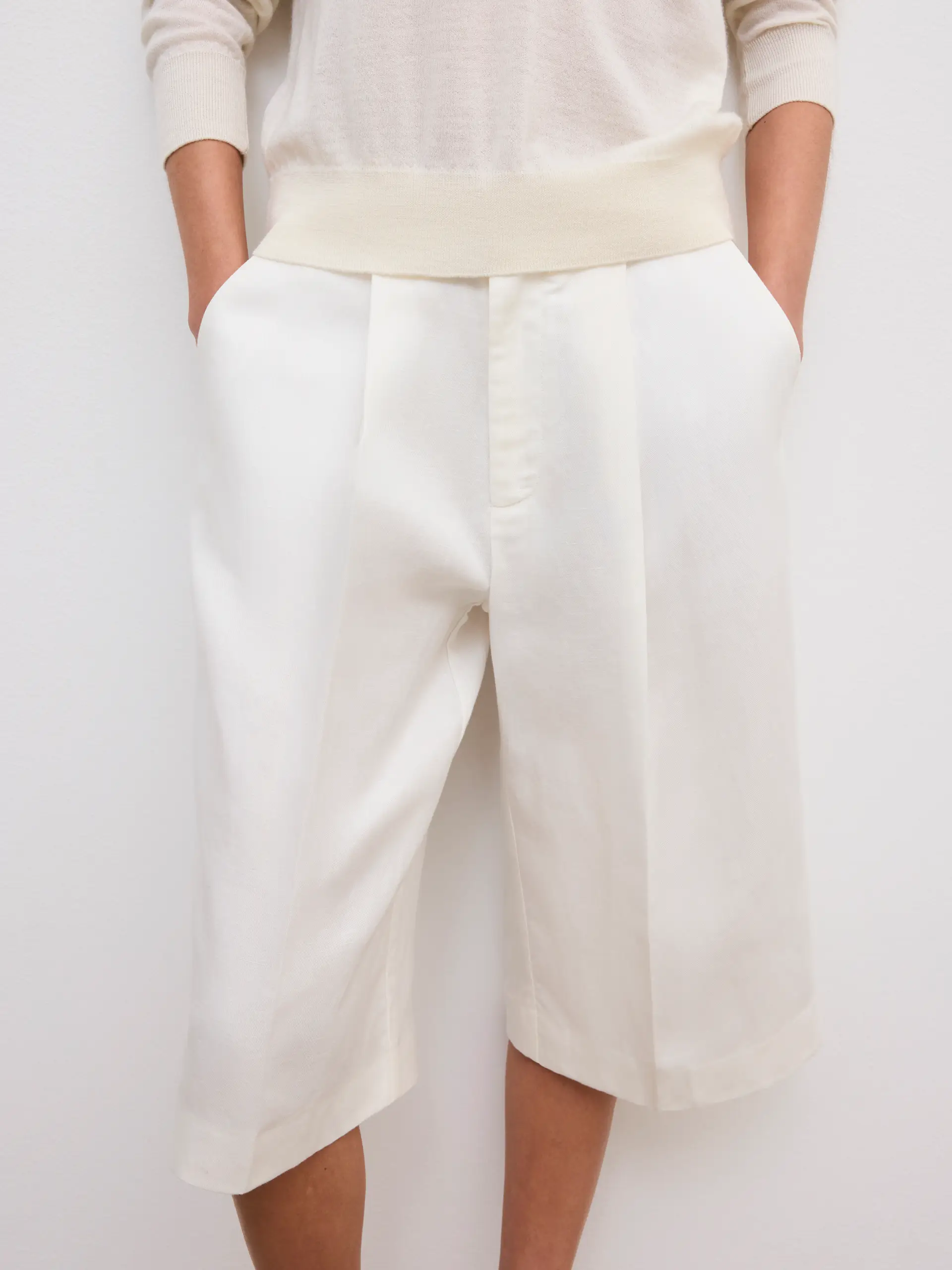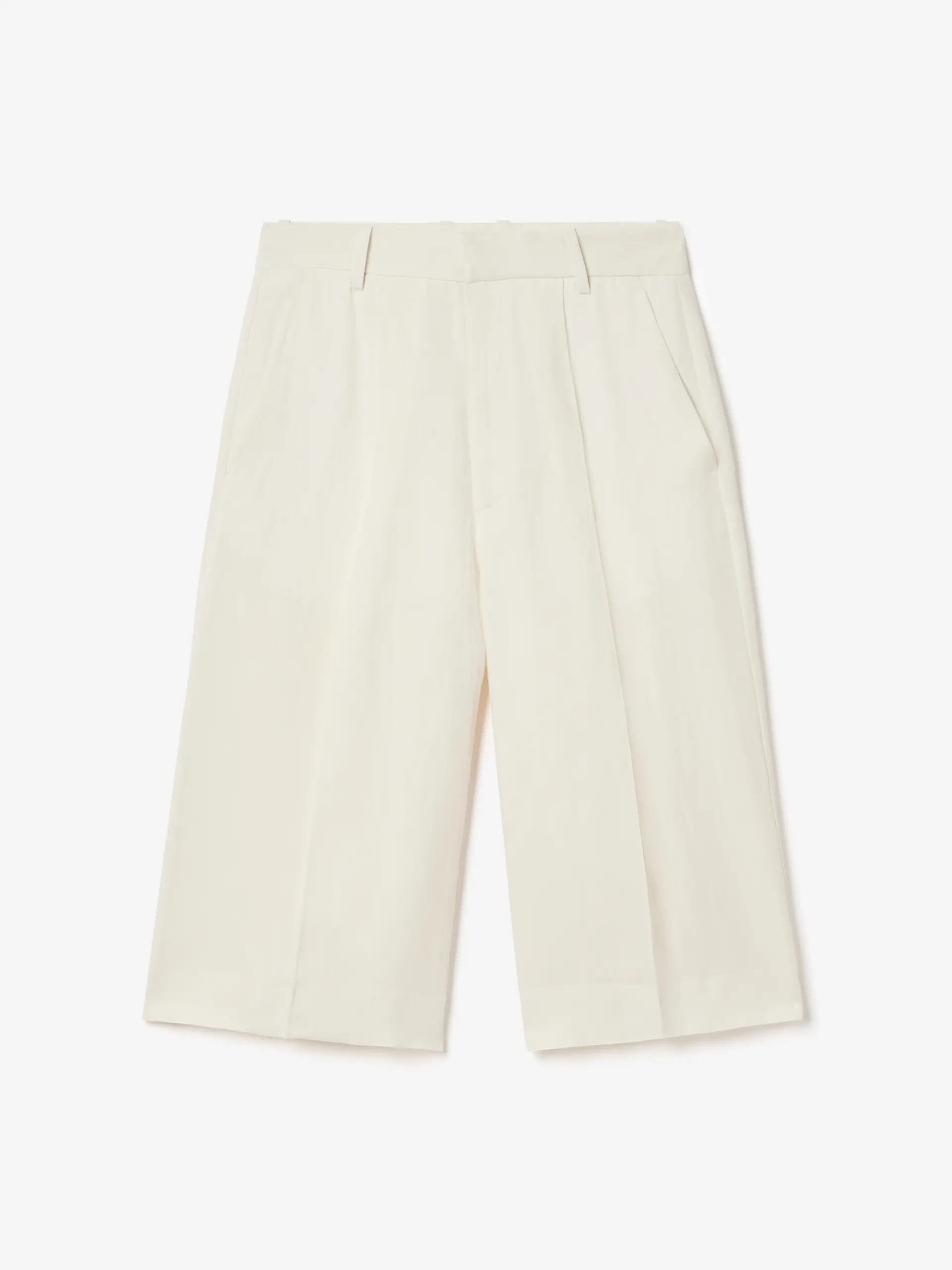 Mid-rise shorts in a fluid linen blend with a wide leg falling just below the knee. Tailored details include dual front pleats, slanted side pockets, back welt pockets, and a hook-and-eye closure.