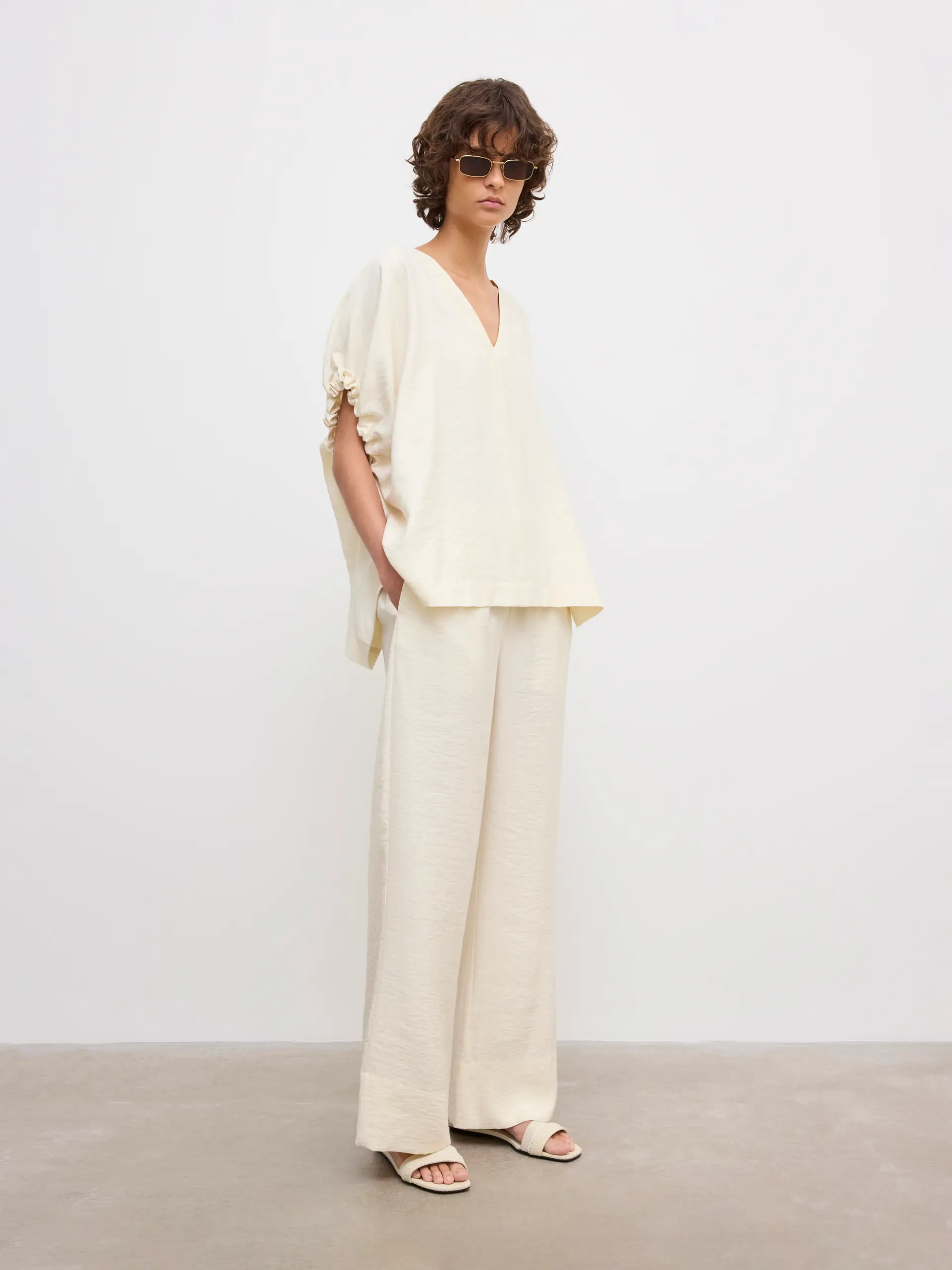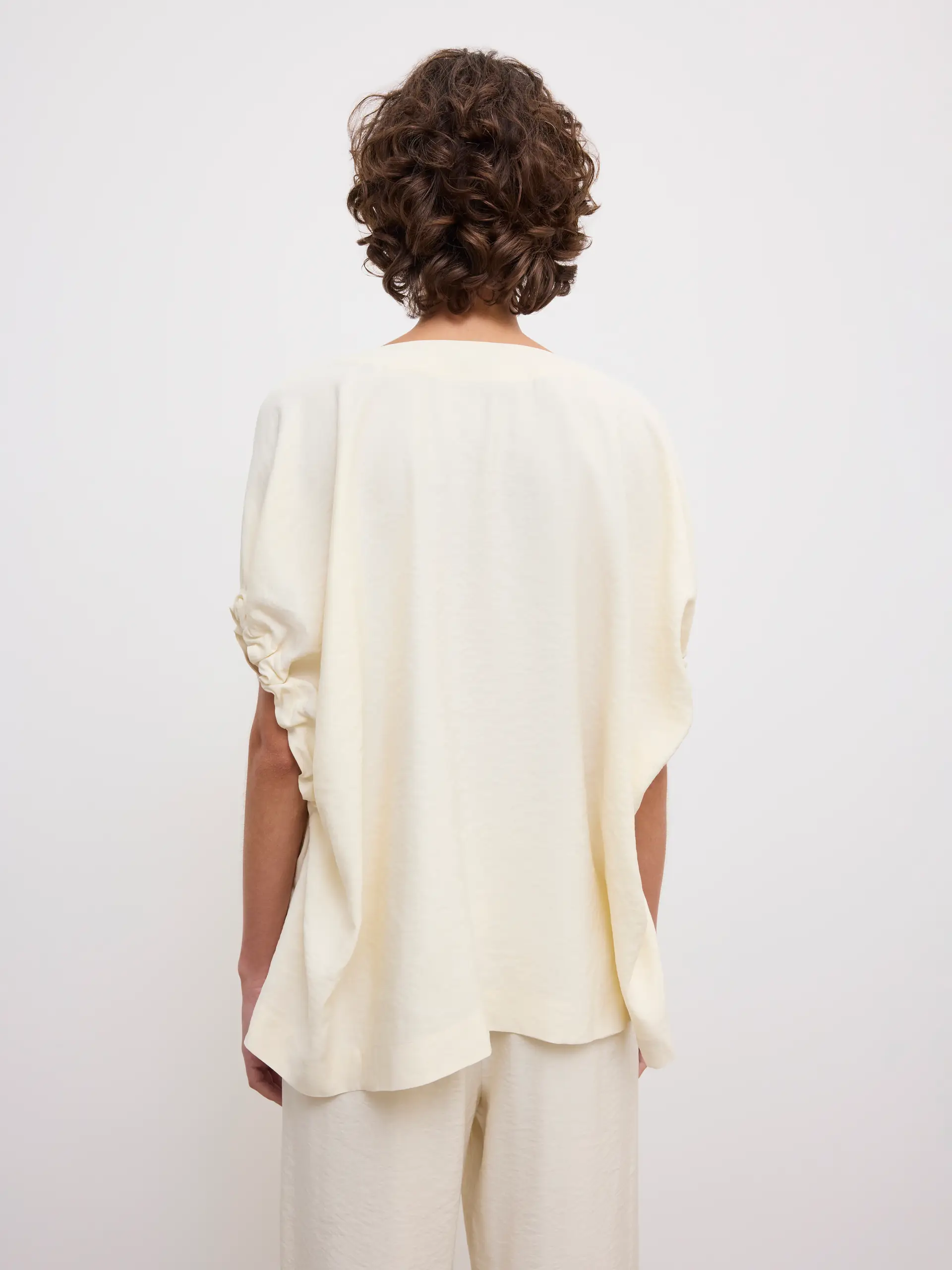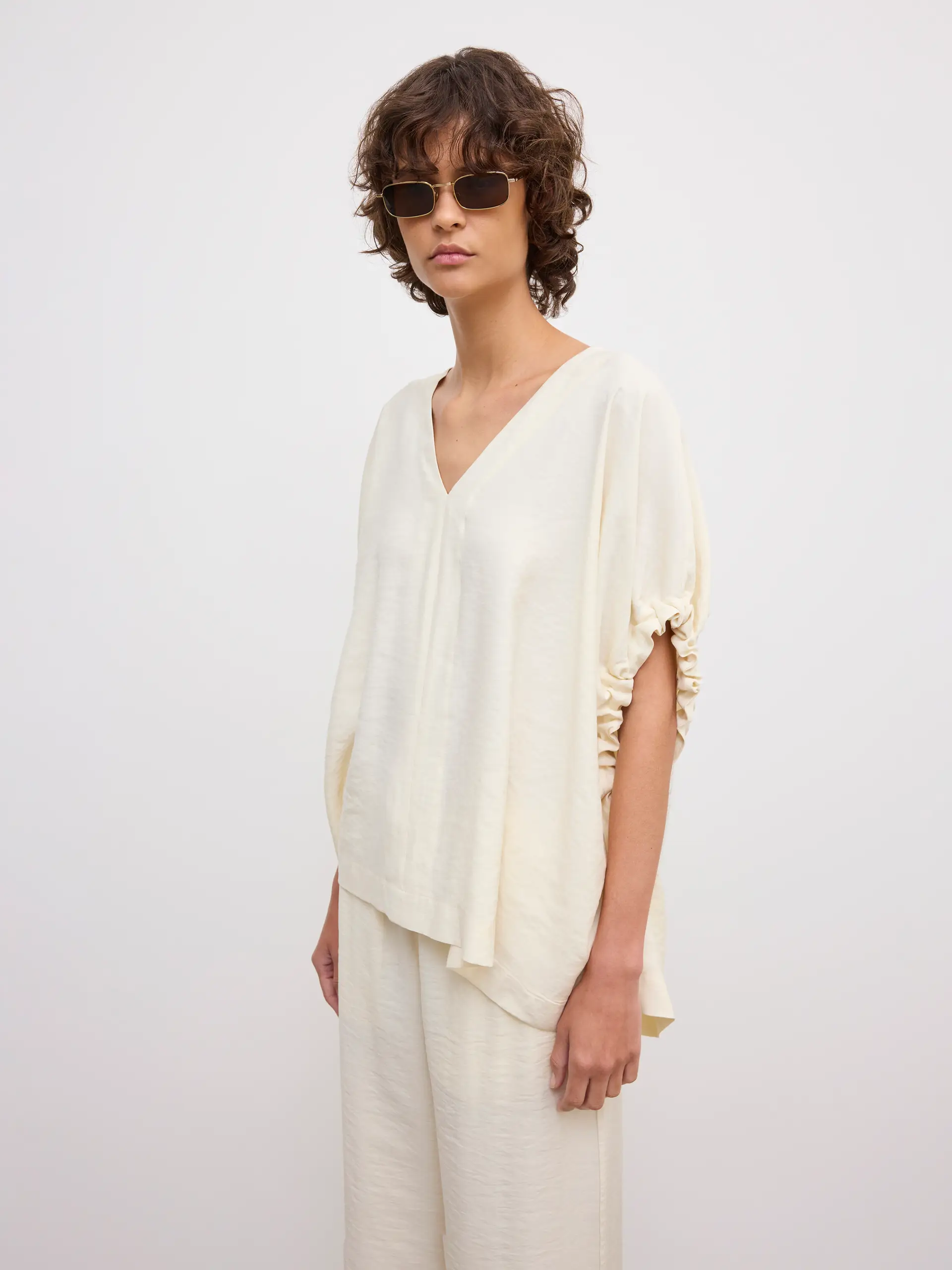 Pop-over top in a fluid modal blend with a voluminous frame, shaped by a deep V-neck and gathered sleeves artfully draping down.