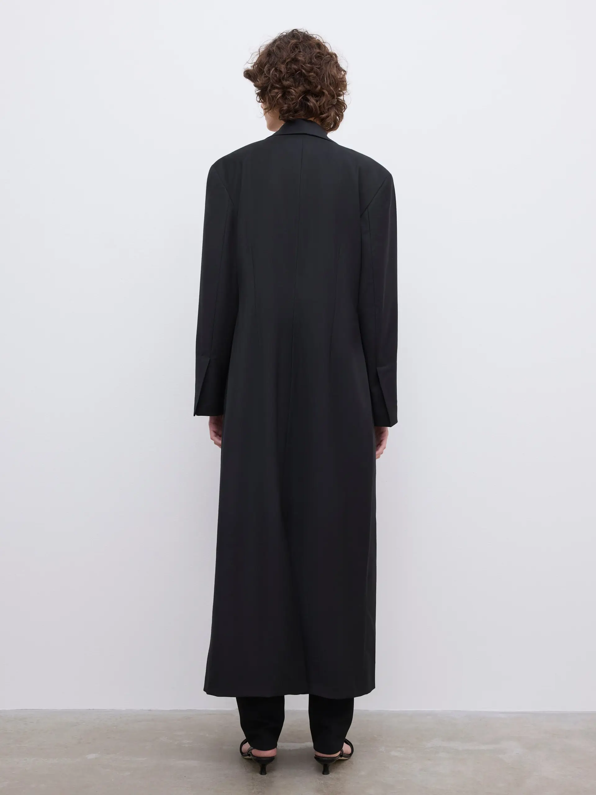 Crafted in our wool blend suit fabric, the Long Tailored Blazer is double-breasted with a high slit at back. Sharply tailored, this contemporary take on suiting features fabric covered buttons and front welt pockets.