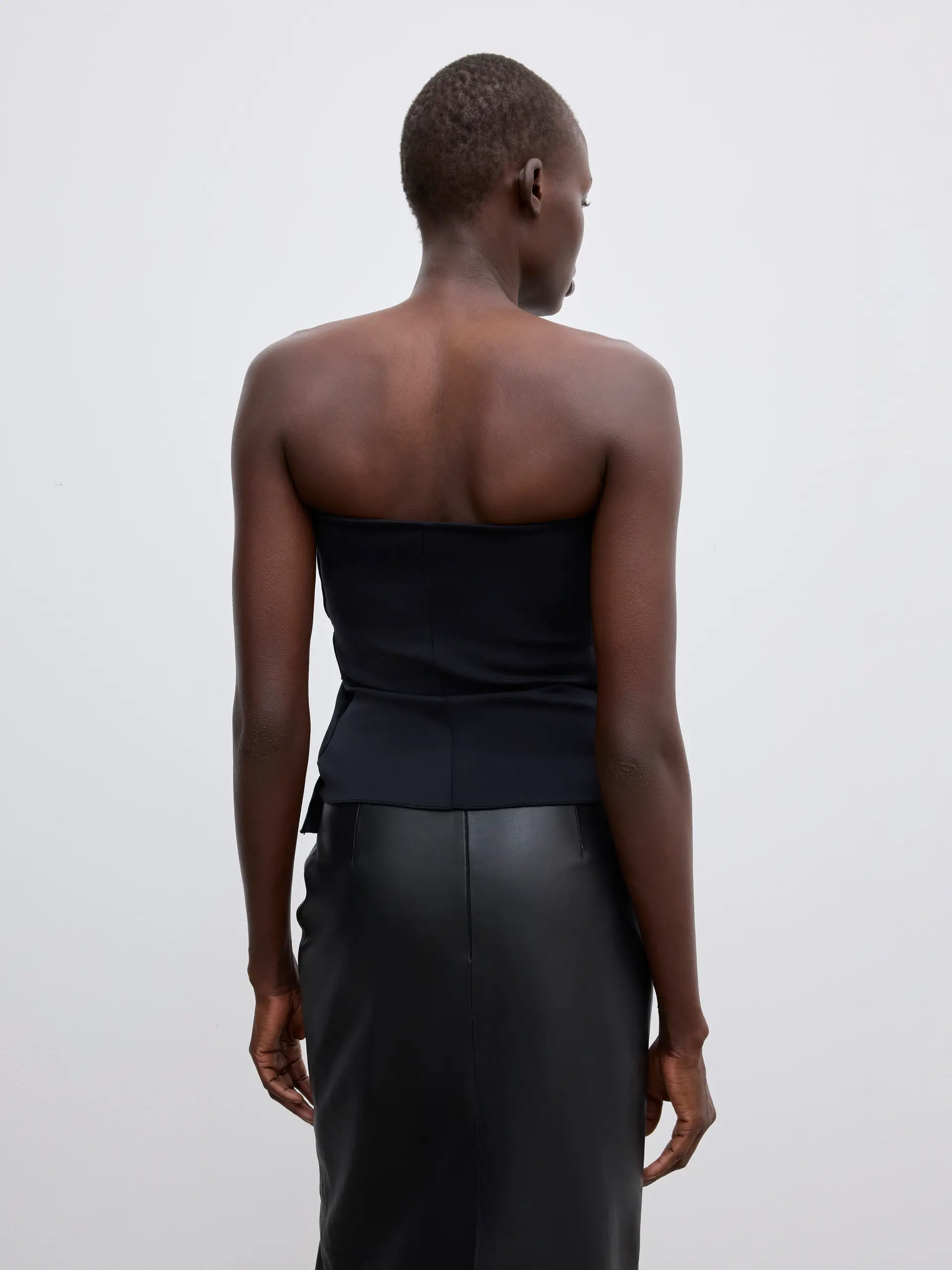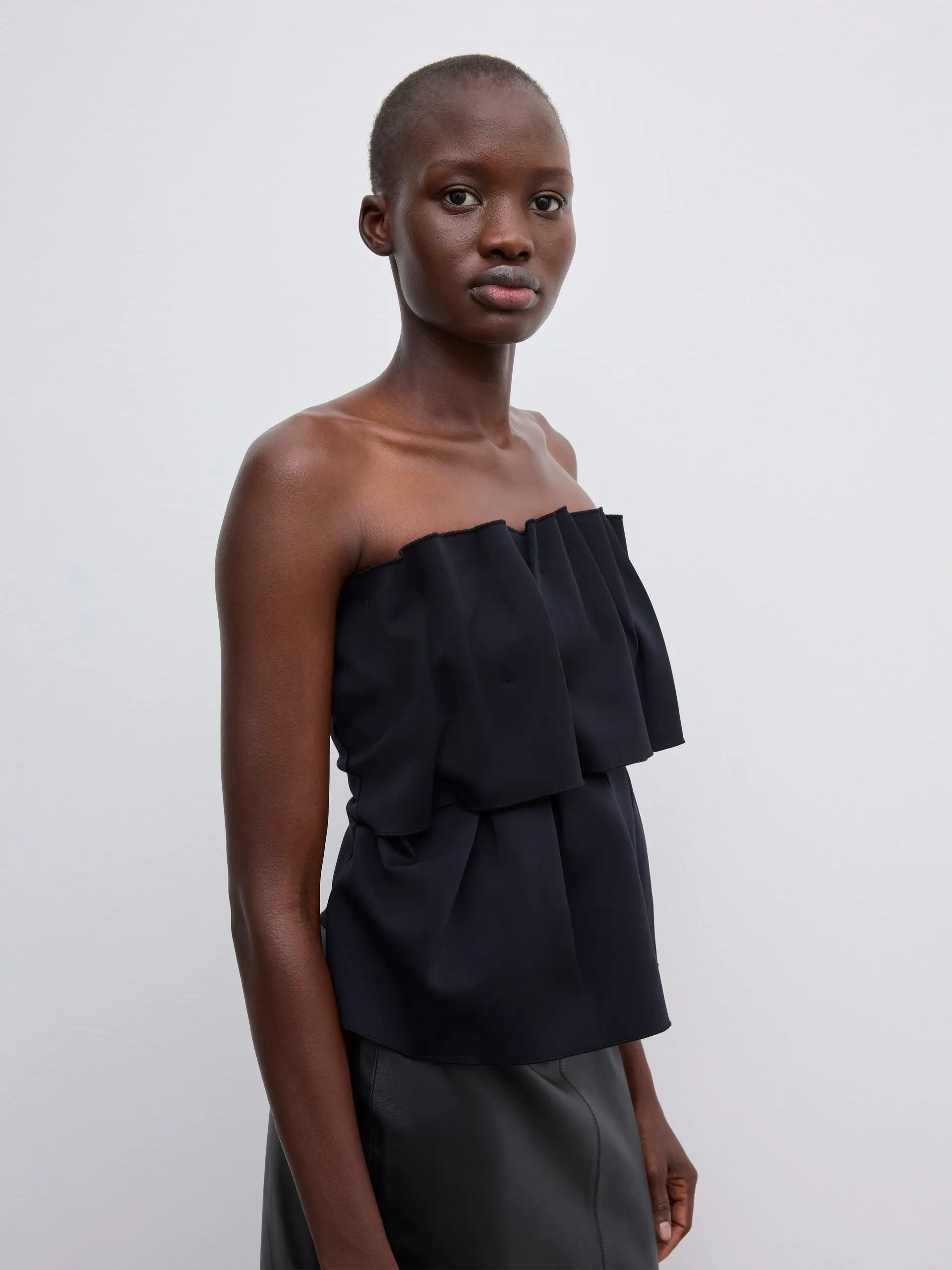 The Sculpted Tube Top is made from recycled polyamide and elastane blend. Accentuated by an artful drape and a layered look. This top has a close fit and if in between sizes we recommend to size up one size.