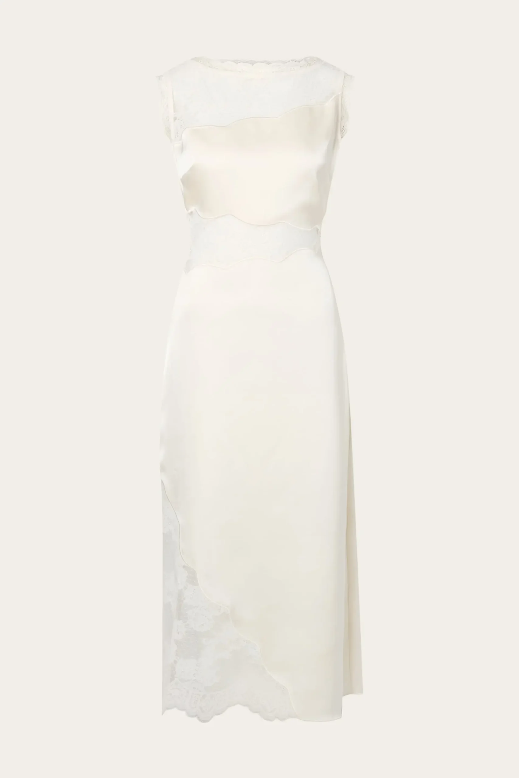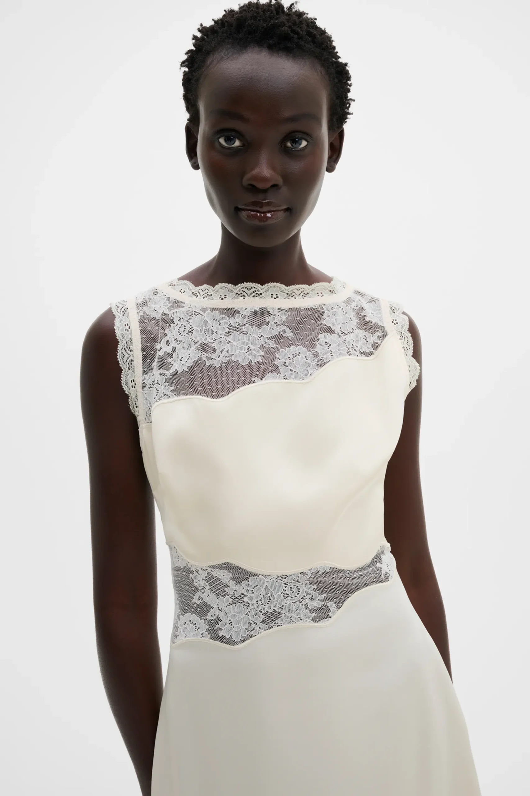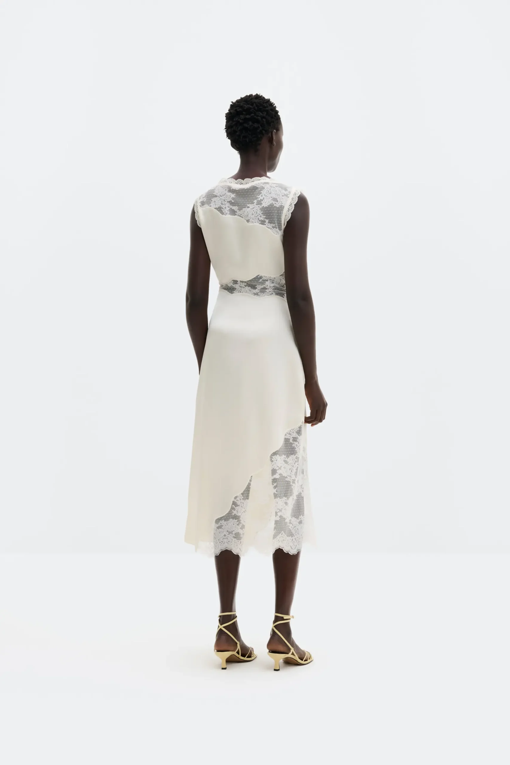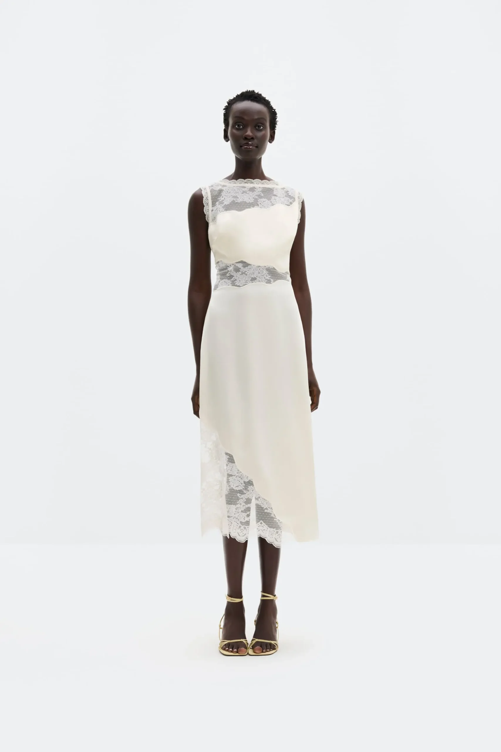 Sleeveless midi dress with lace cut out details.