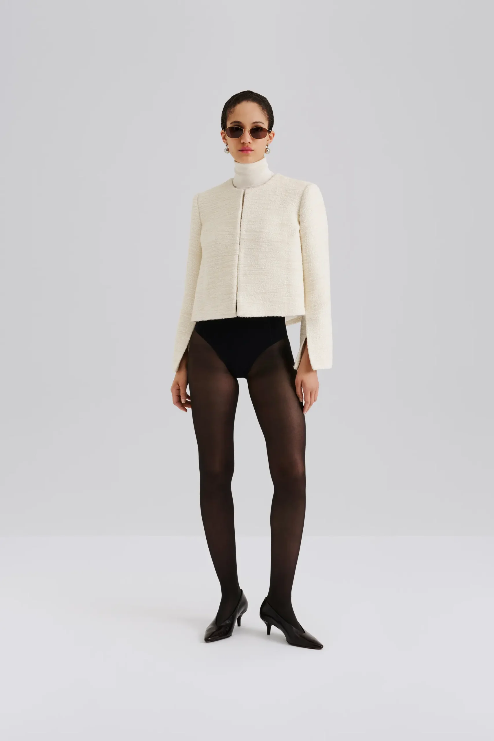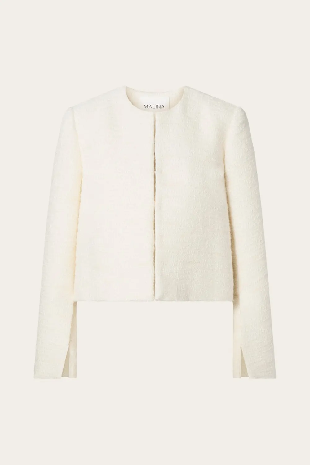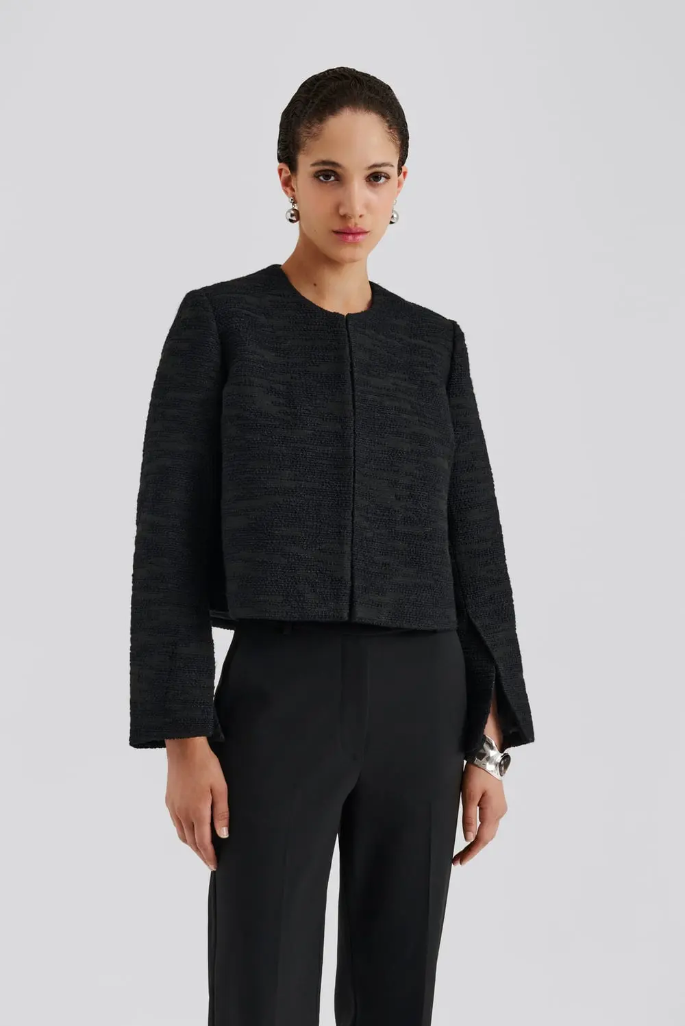Cropped boucle blazer with slit detail sleeve.