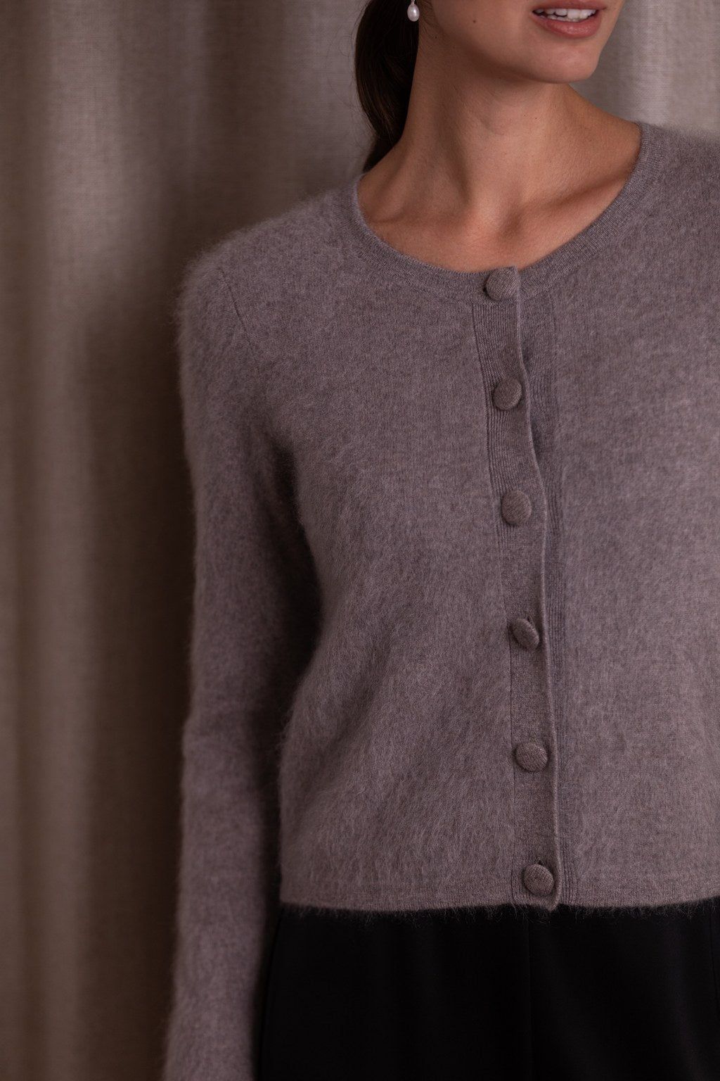 This cashmere cardigan is made from 100% cashmere, offering a luxuriously soft feel and a refined appearance. The front is finished with six delicate fabric-covered buttons that add a polished touch. Set-in sleeves give the cardigan a structured, jacket-like silhouette. Narrow ribbed trims at the cuffs and hem, along with the straight, slightly cropped cut, create a modern and clean look. The wide, rounded neckline drapes beautifully and makes the cardigan easy to pair with various tops and outfits.