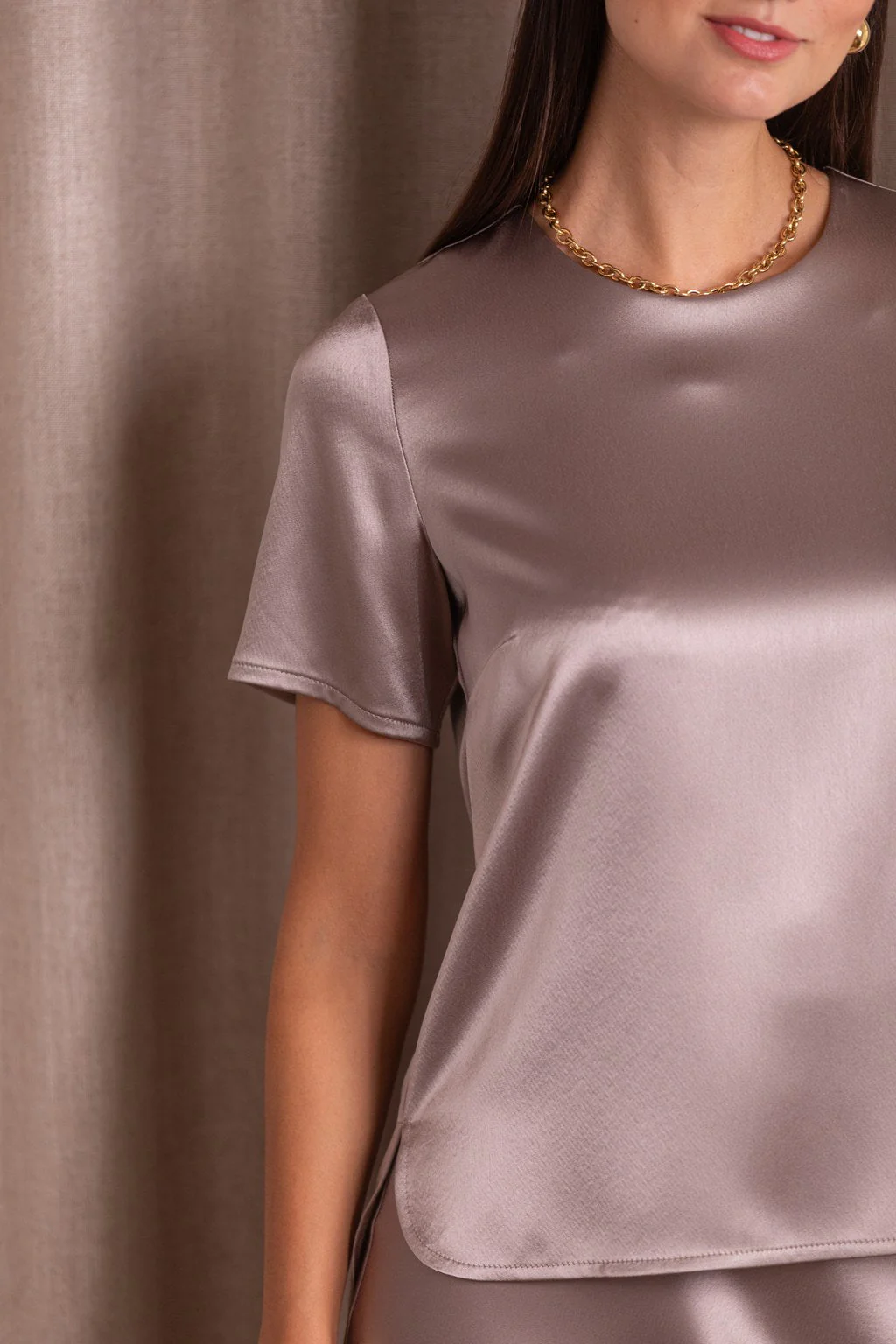 The short-sleeved satin shirt has a normal straight cut and a fitted shoulder line for fit and posture. Chest shape pleats increase the fit, and side slits with rounded corners and a slightly longer back give the shirt a modern look. There is a pearl button on the back of the round neckline as a beautiful detail.