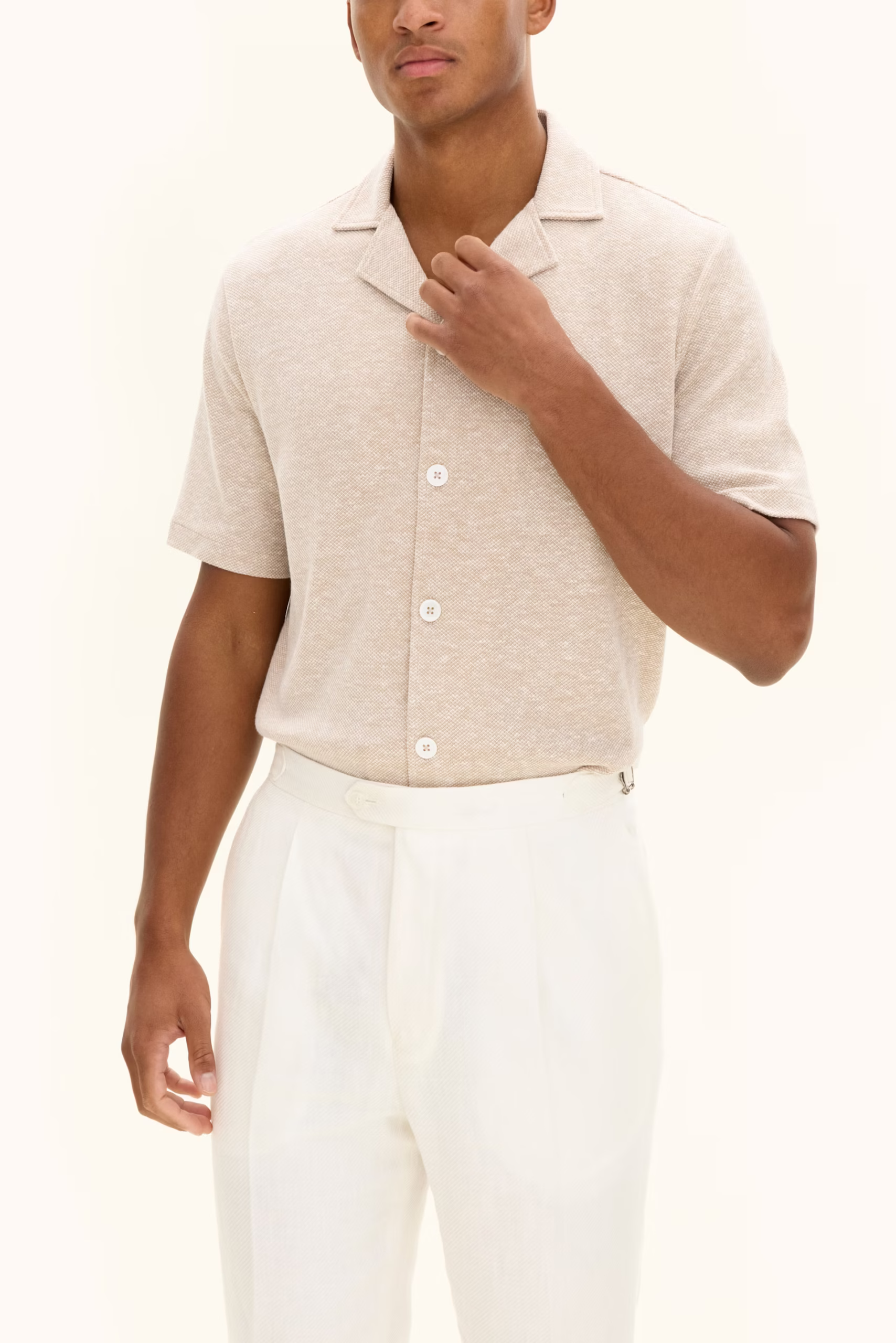 Short-sleeved knitted shirt with an elegant jersey texture. Made from a blend of linen, cotton and polyester, with mother-of-pearl buttons at the front. A comfortable and stylish summer garment for warm days.
