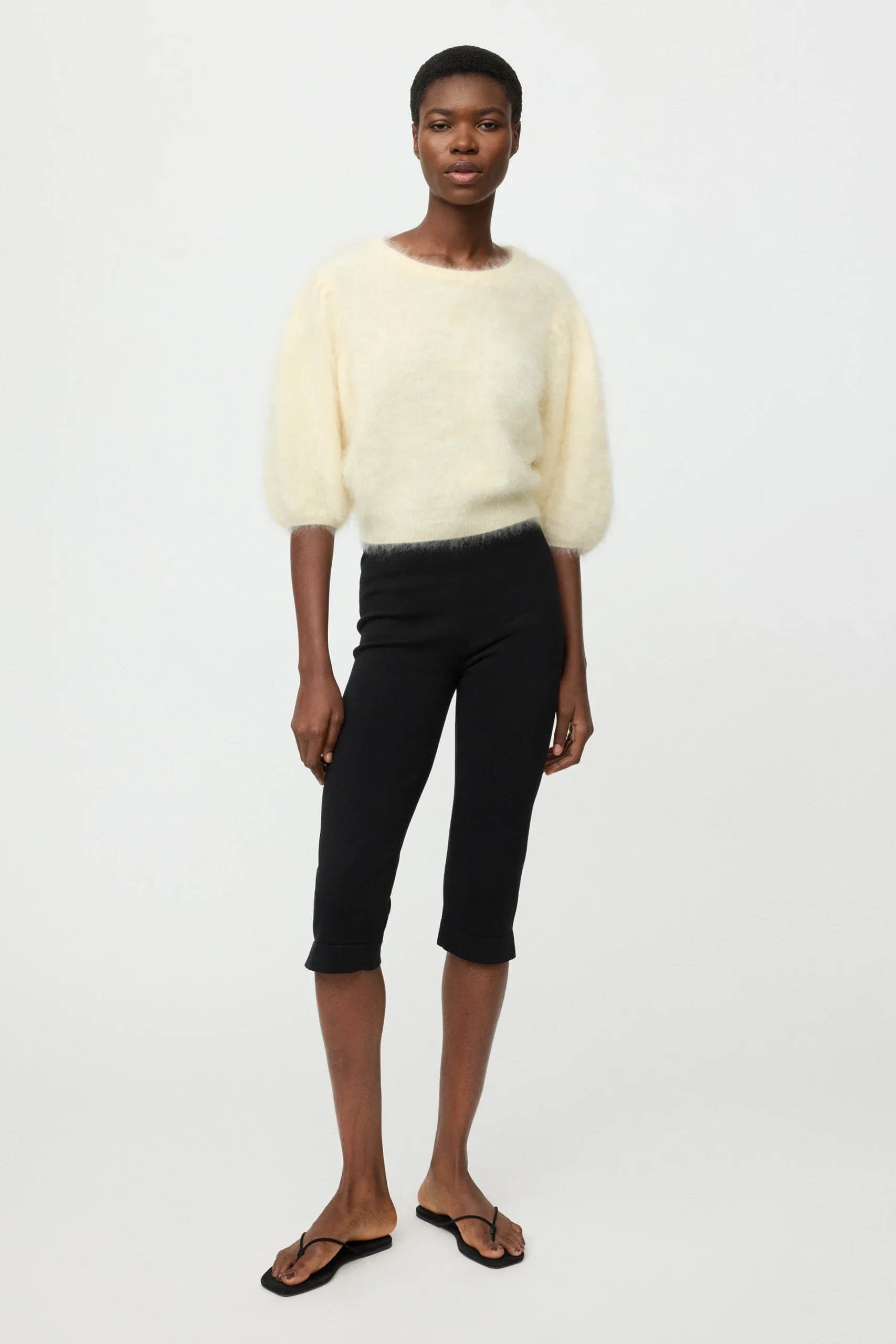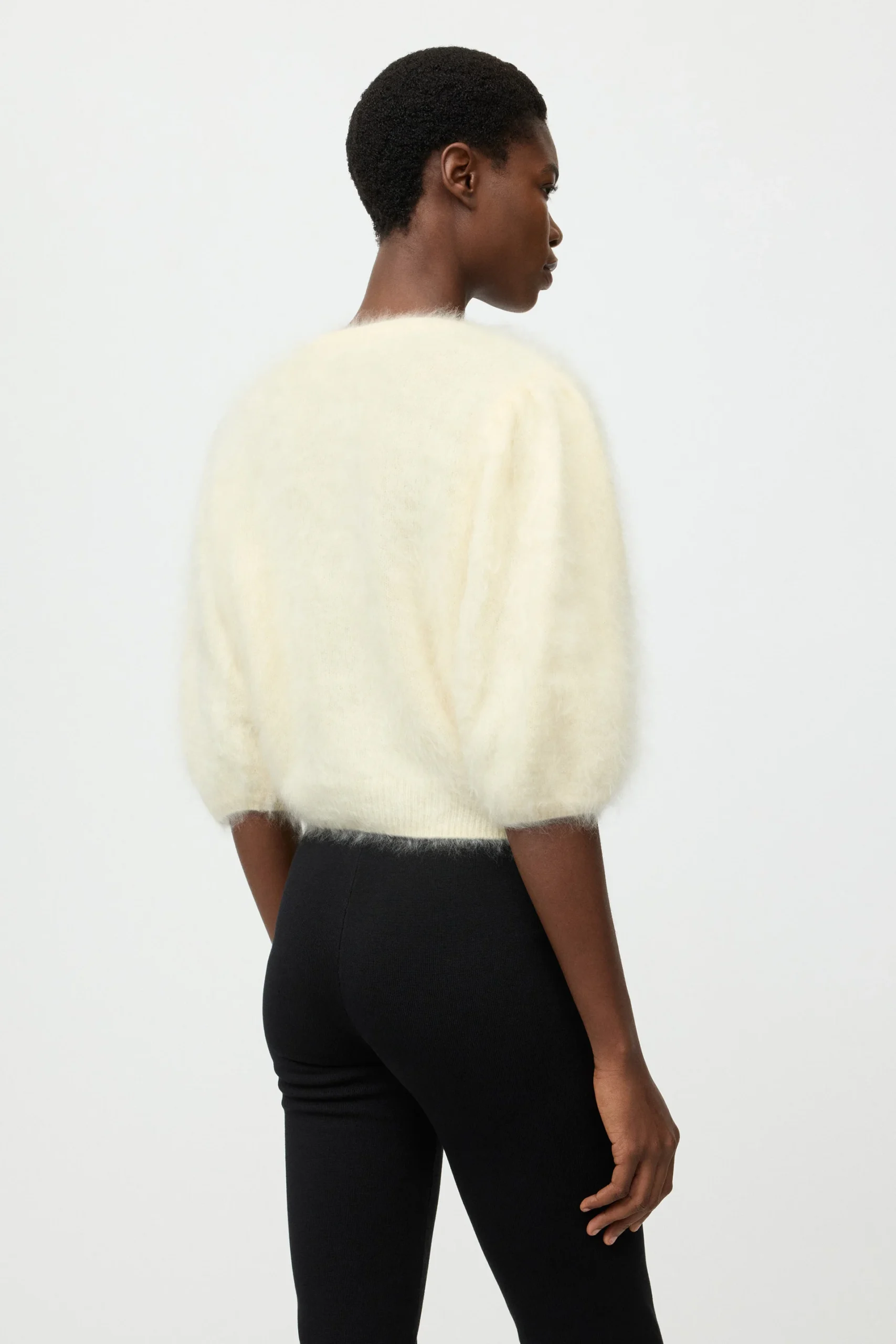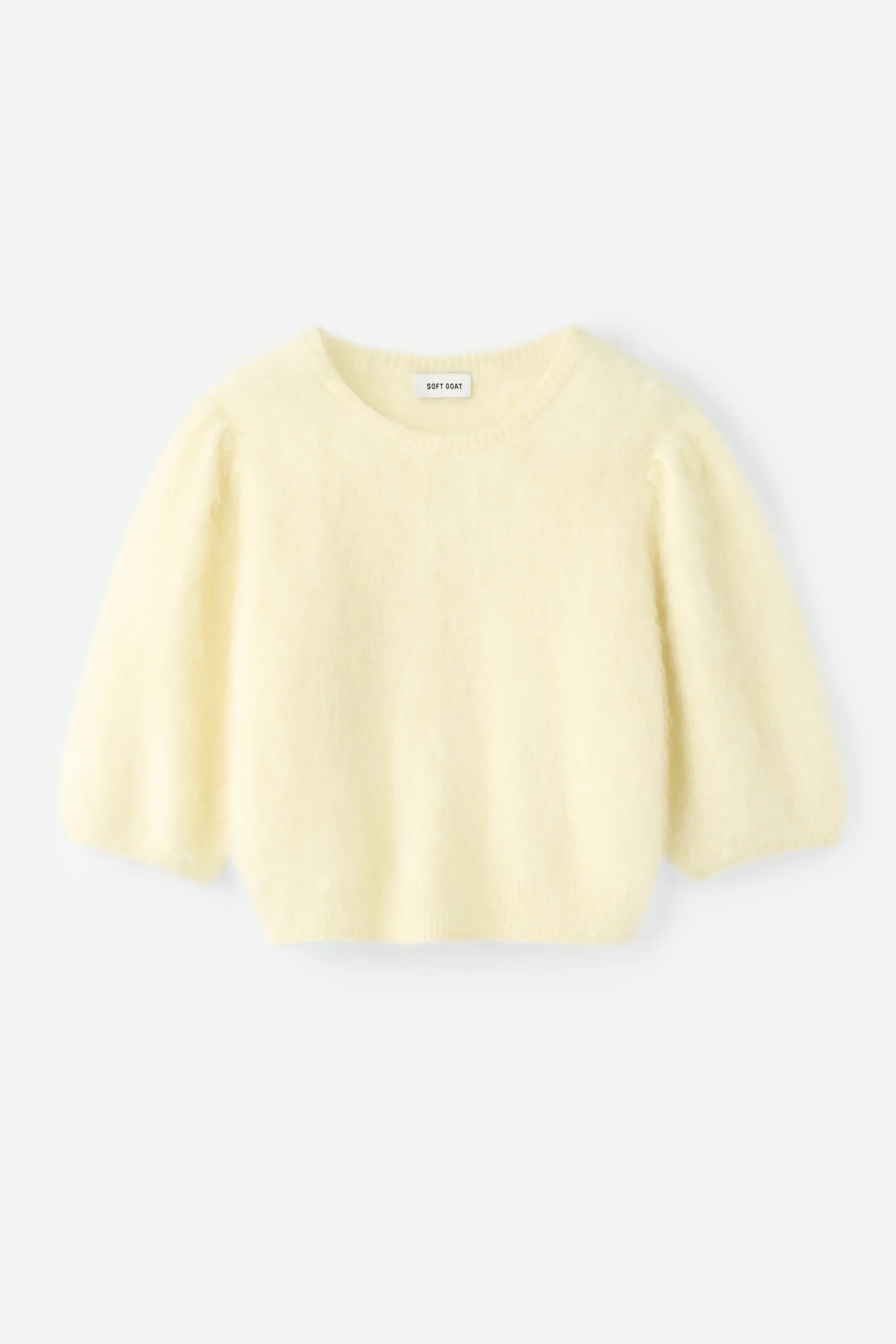 Soft Goat Brushed Top is a brushed crewneck with short puff sleeves in 100% cashmere. Pair with the Soft Goat Silk Pants.