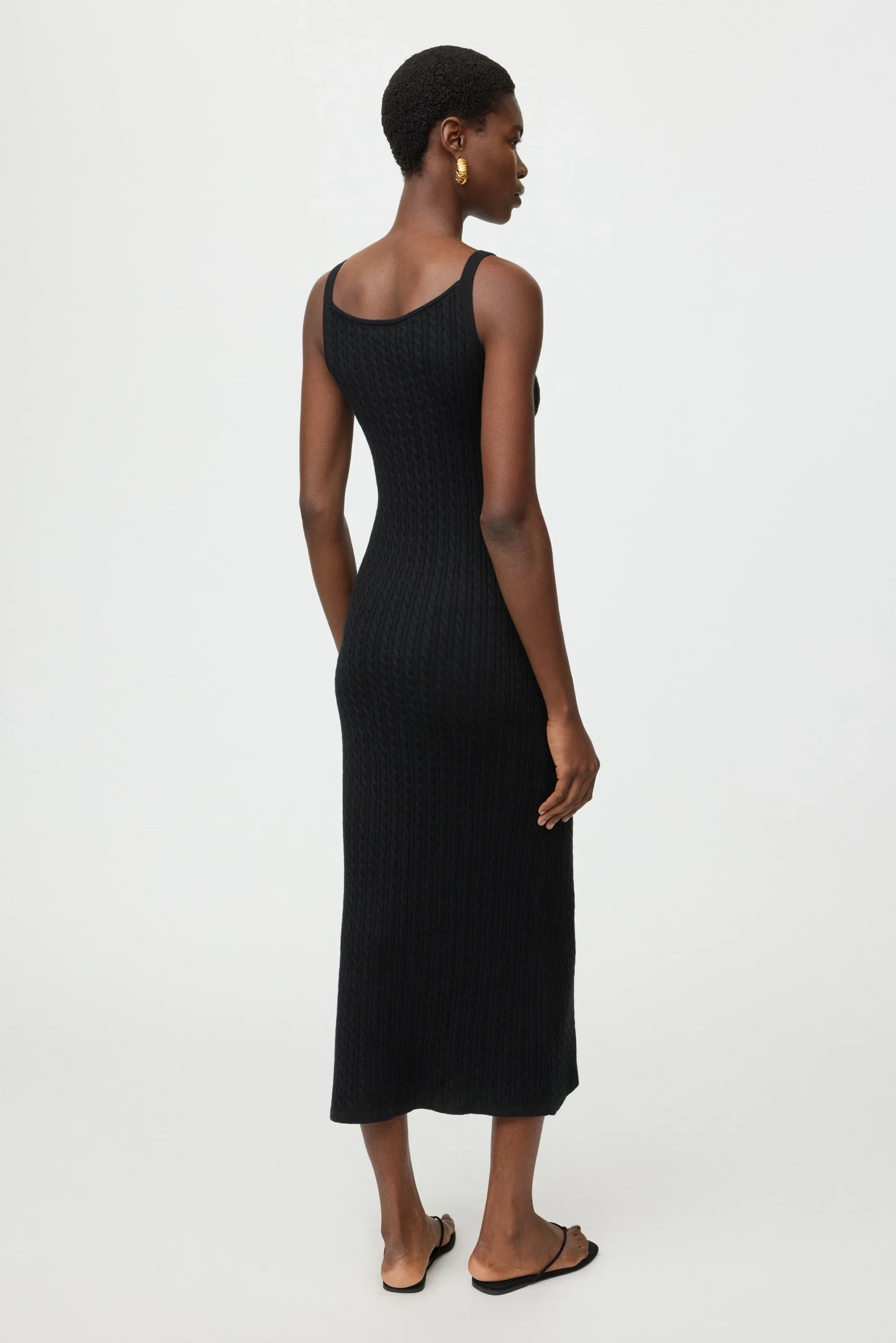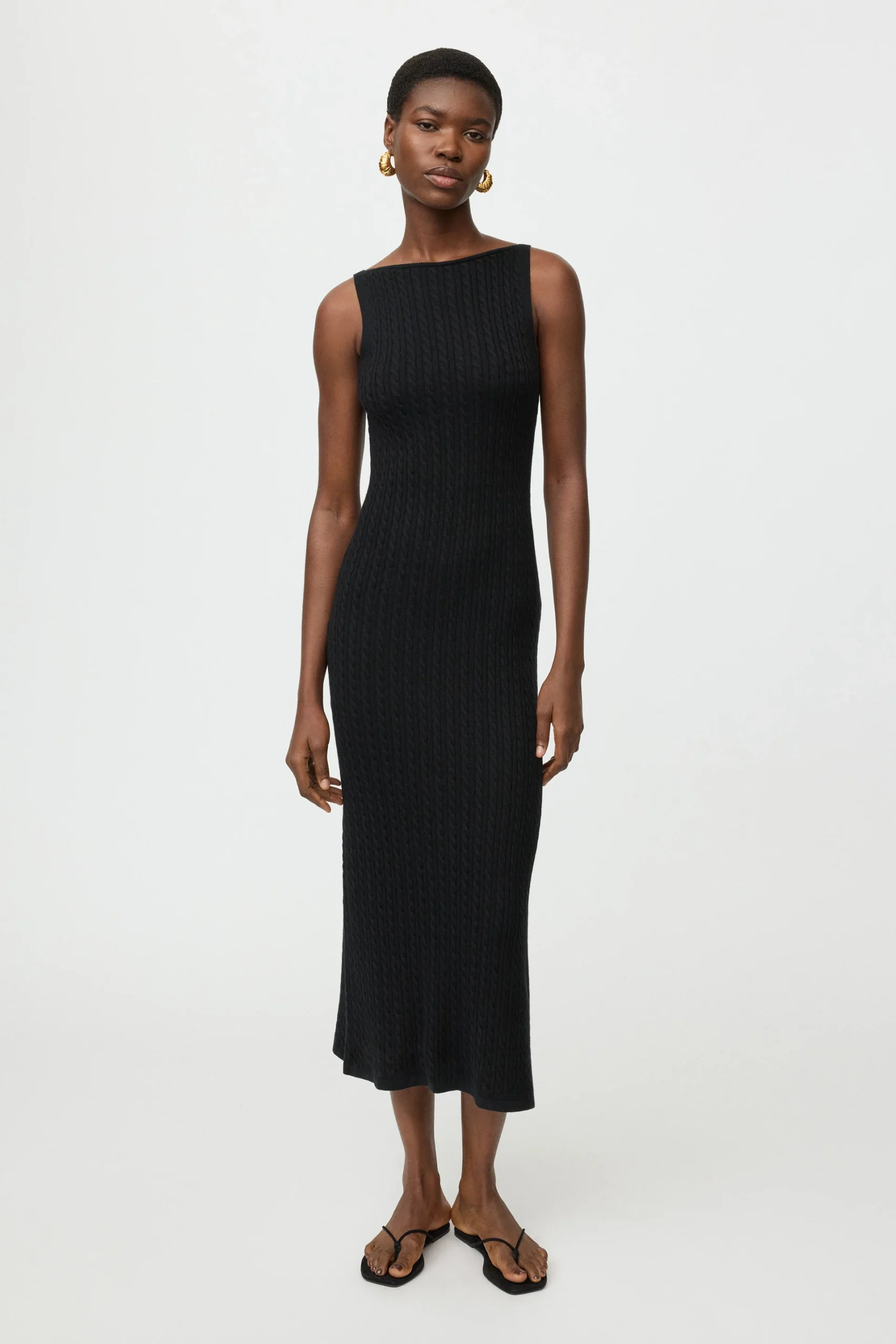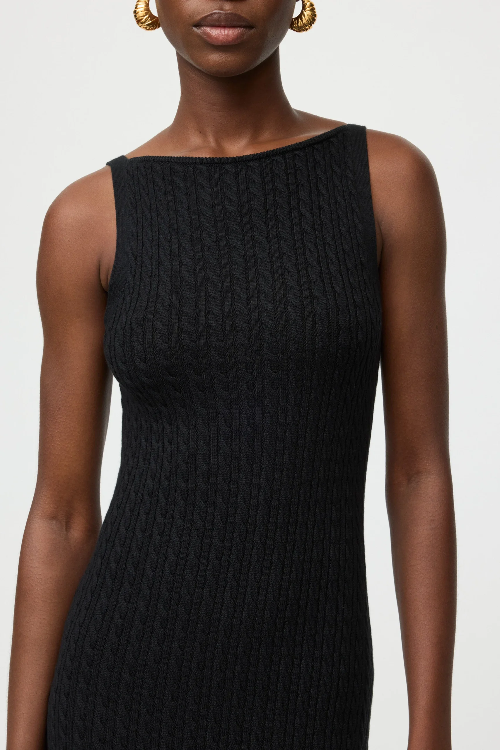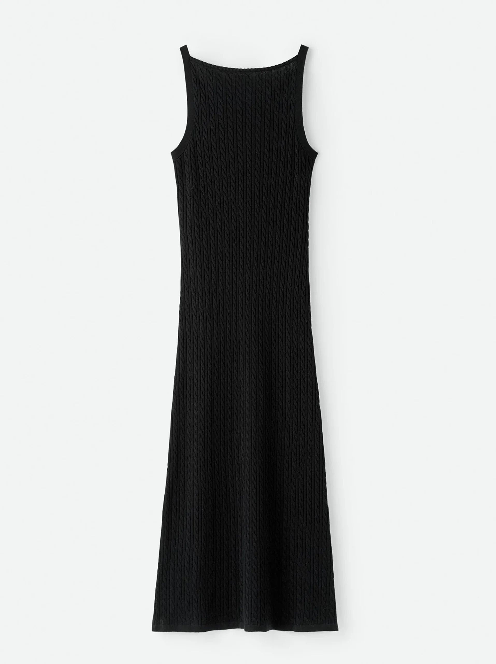 Soft Goat Fine Knit Cable Knit Dress is a sleeveless cable knit midi dress with boat neckline in a silk cashmere blend.